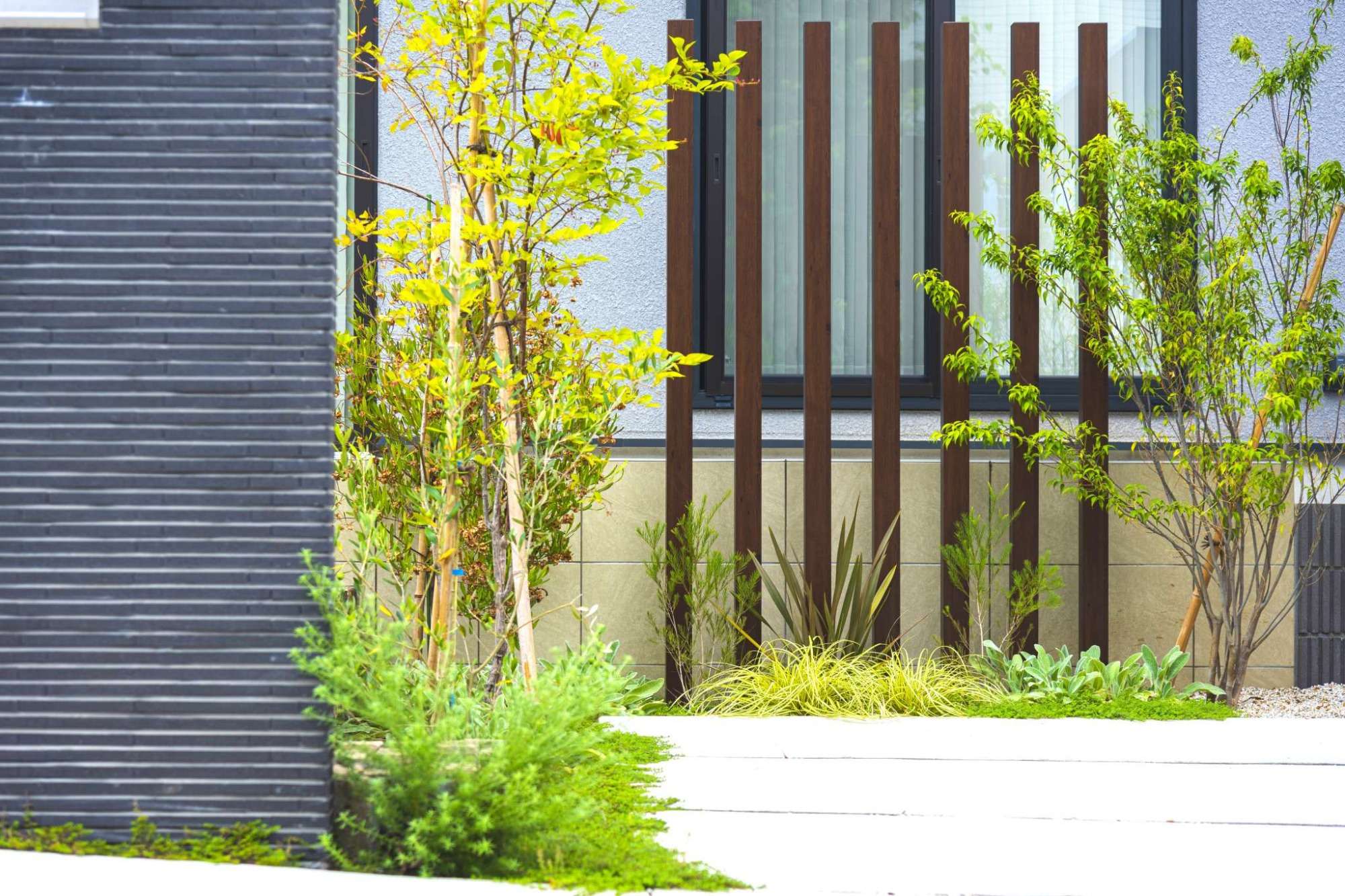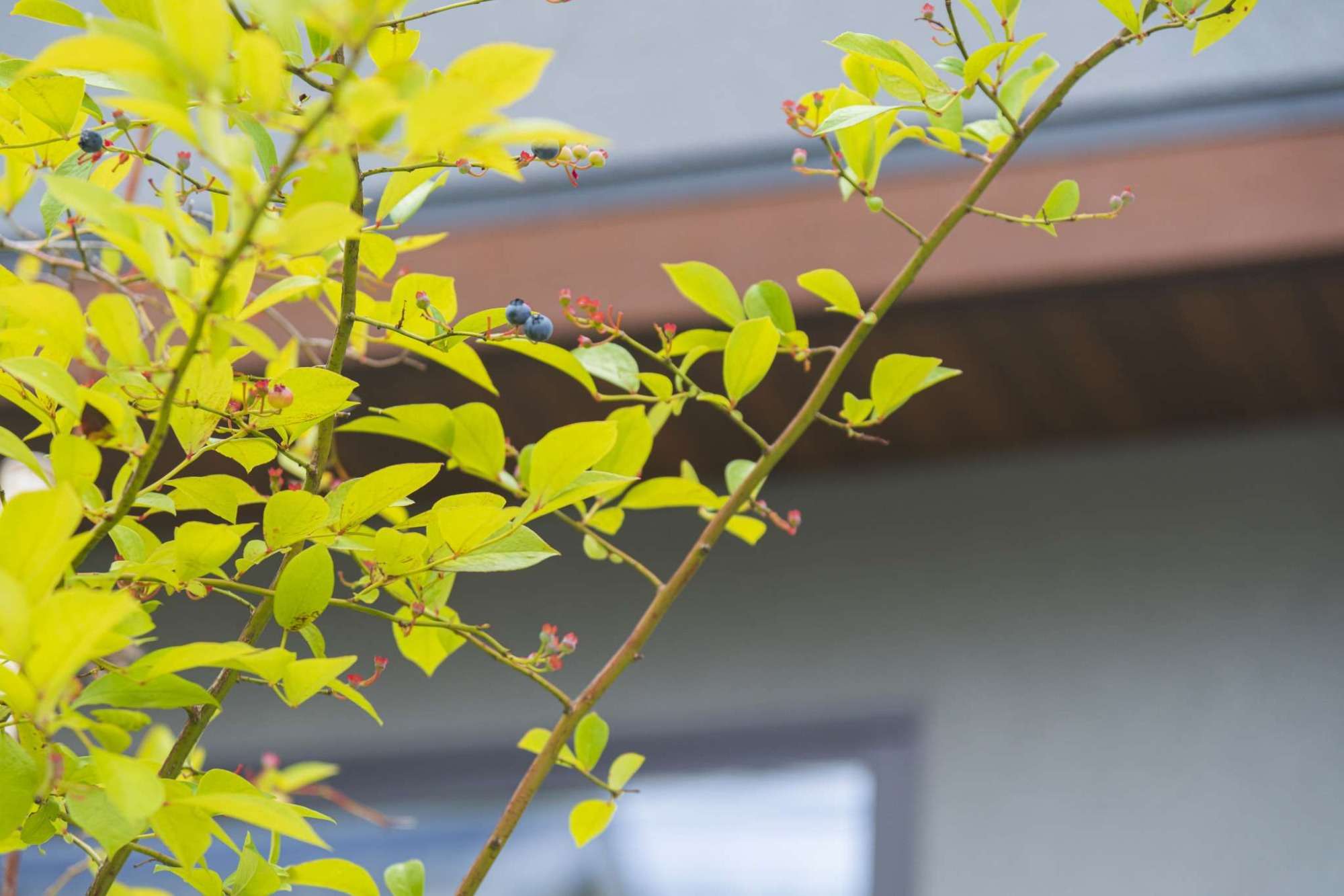 そこへ植栽の鮮やかさや瑞々しさ、動きを添えて、落ち着きのあるブルーグレーの建物と調和を。