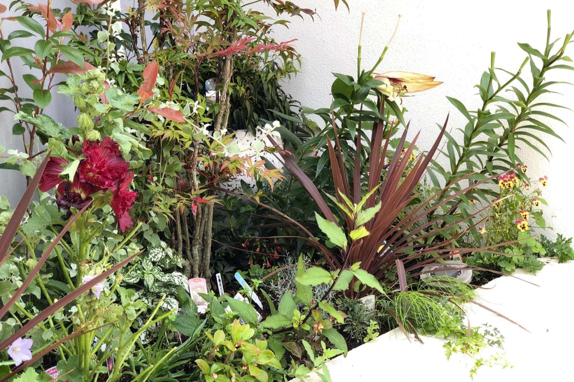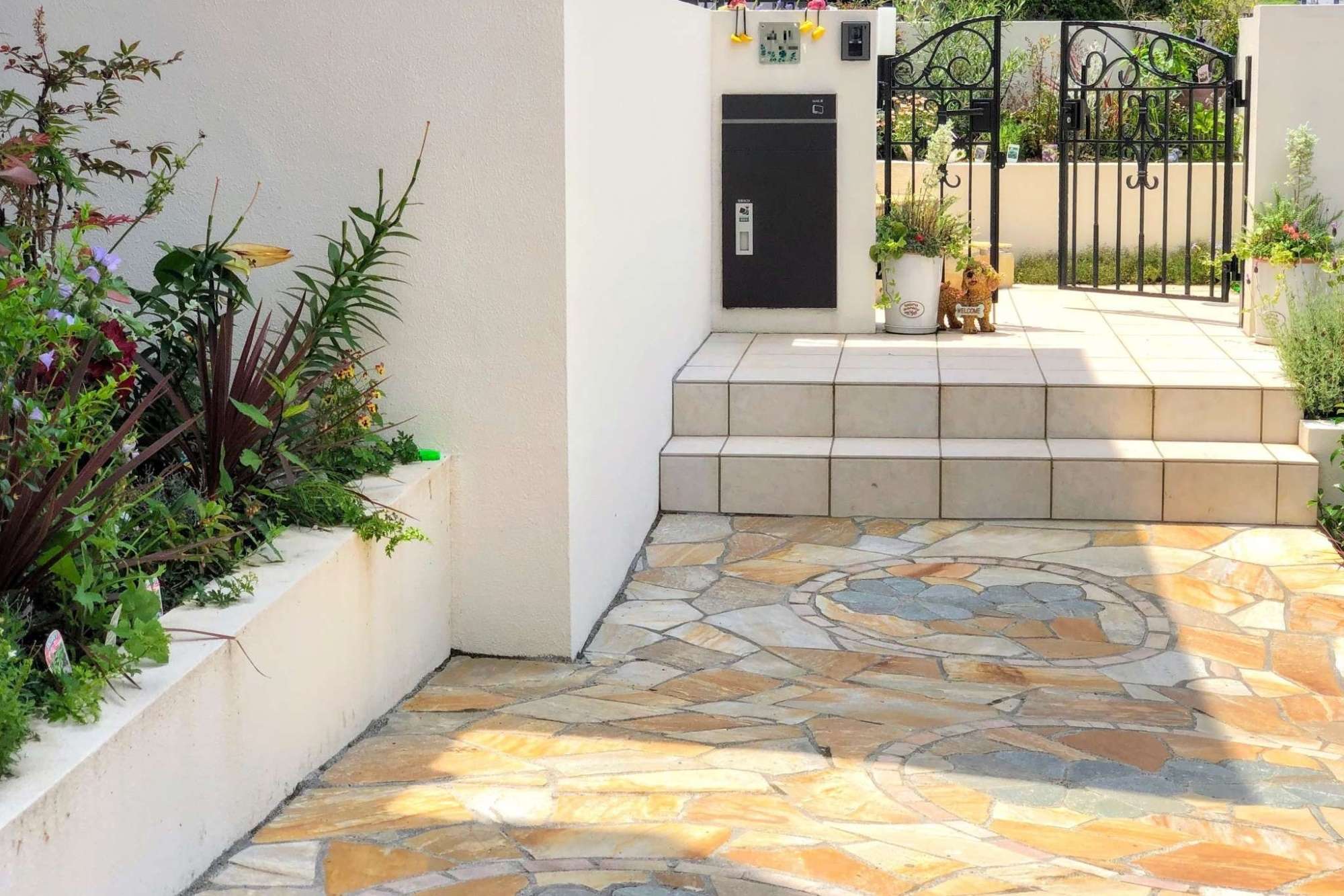 自然石はいろんな色味があり、デザインに合わせて石を切って組み合わせて施工しています。