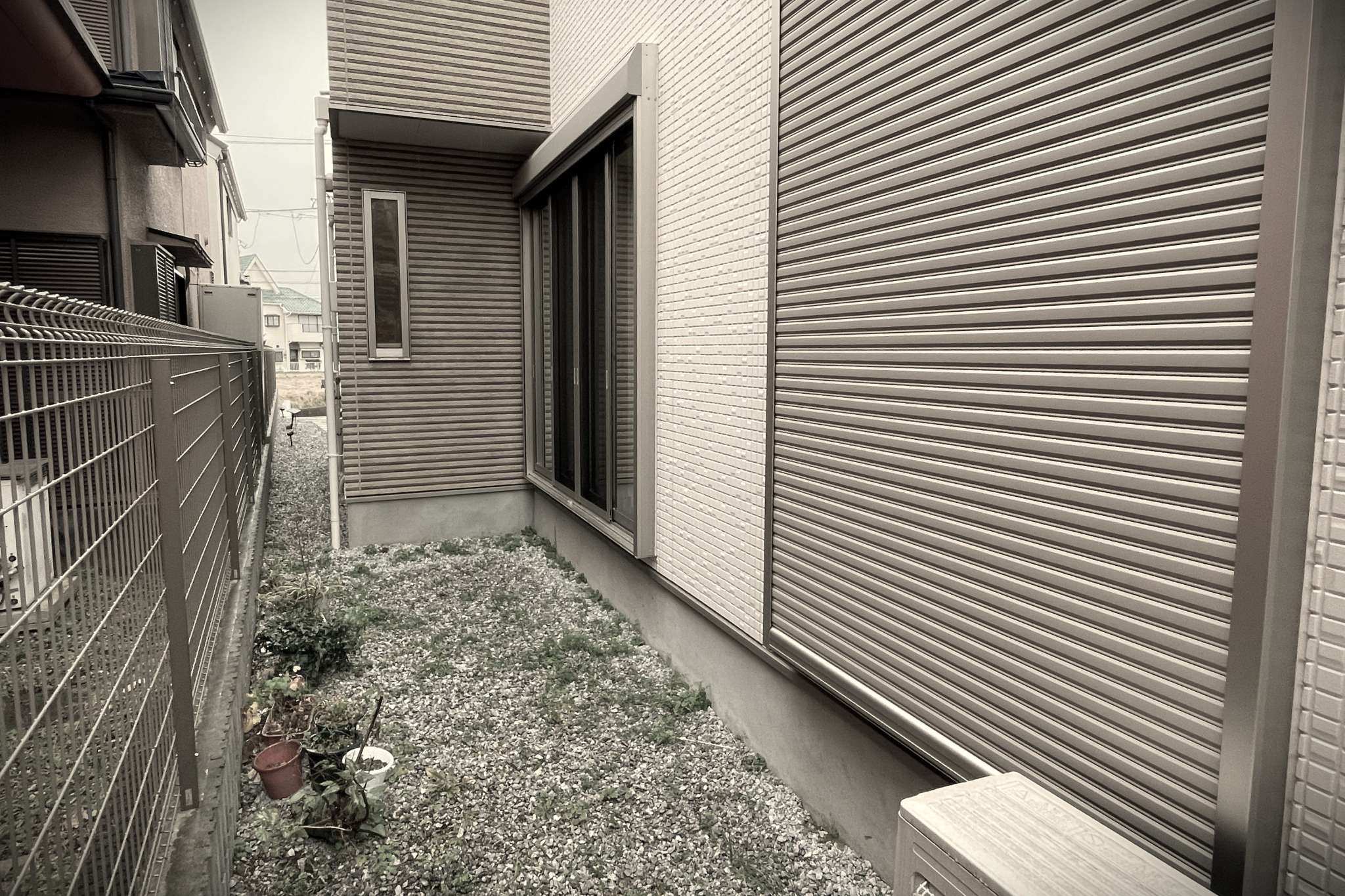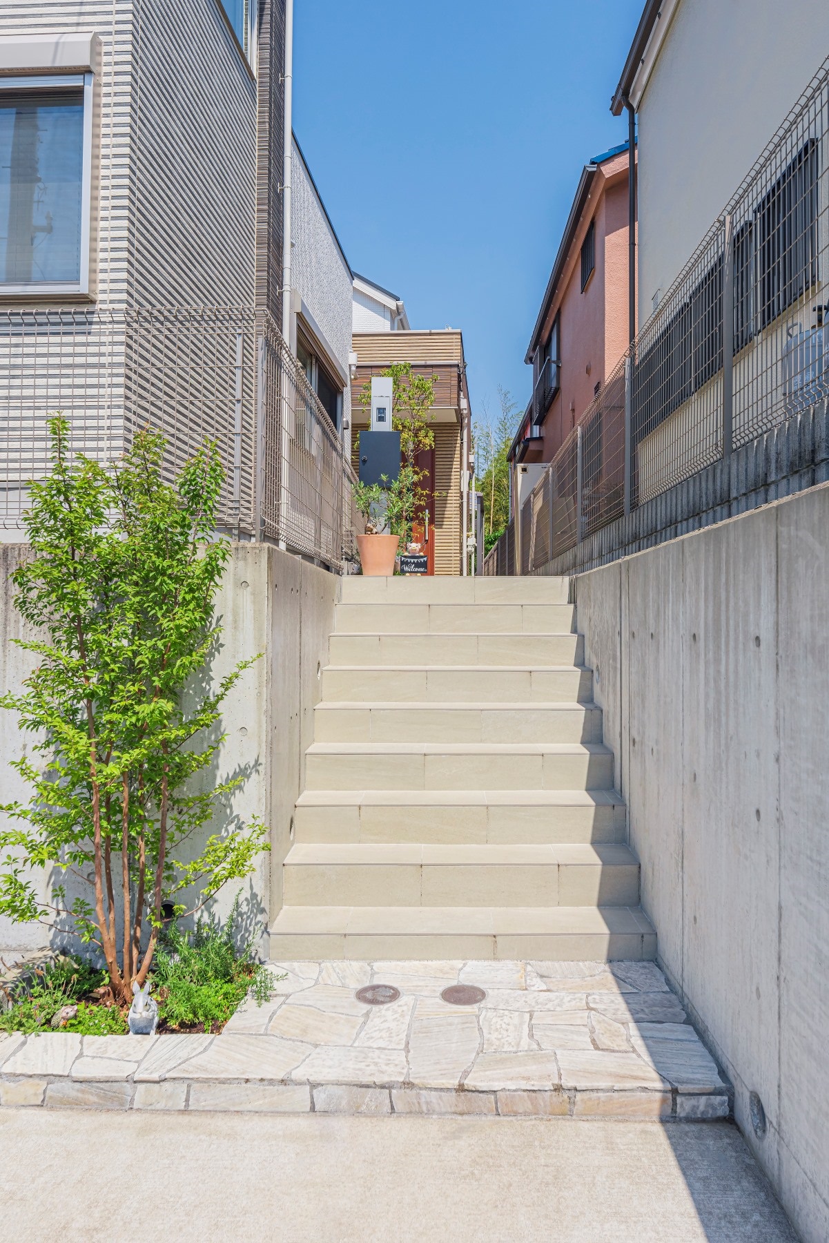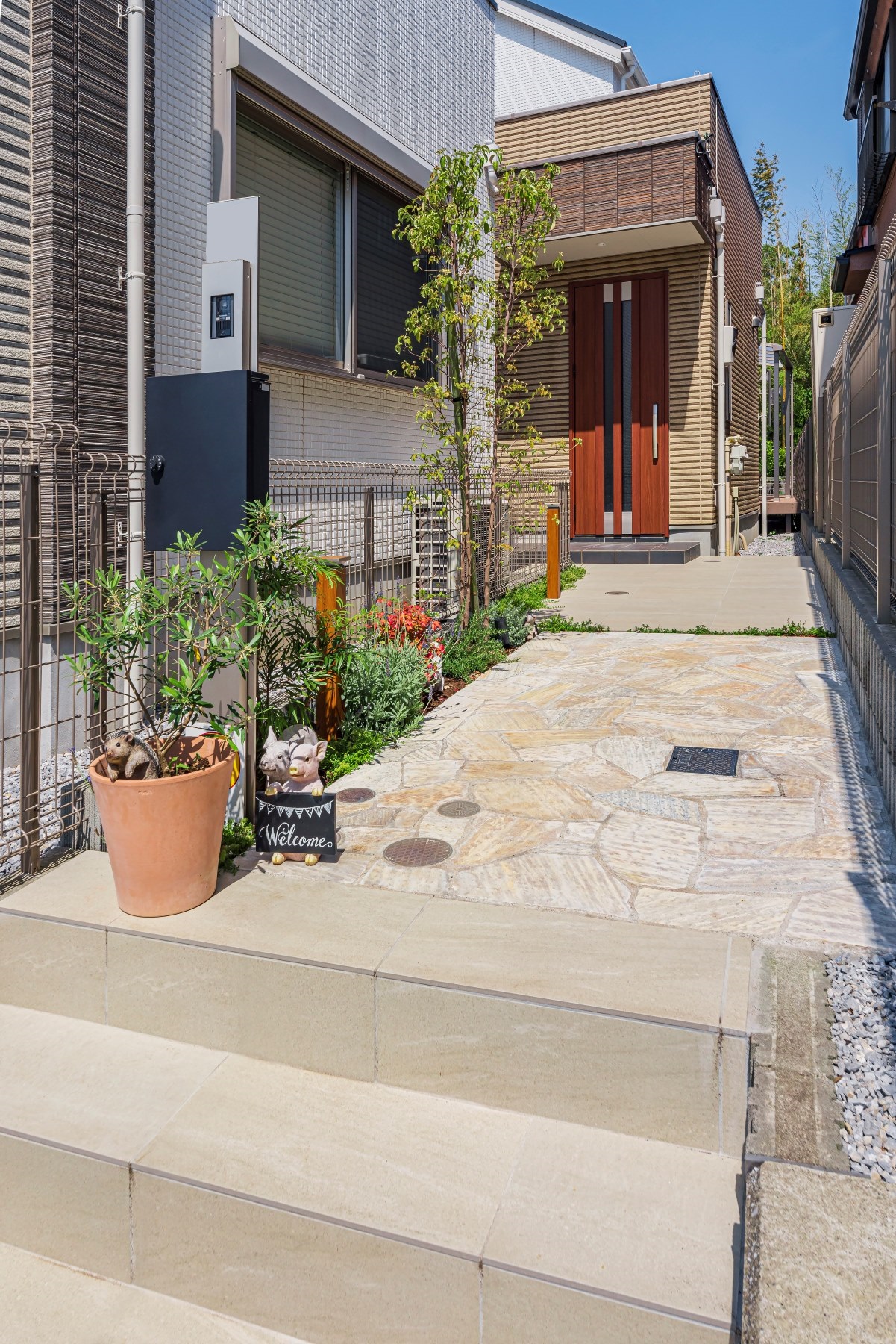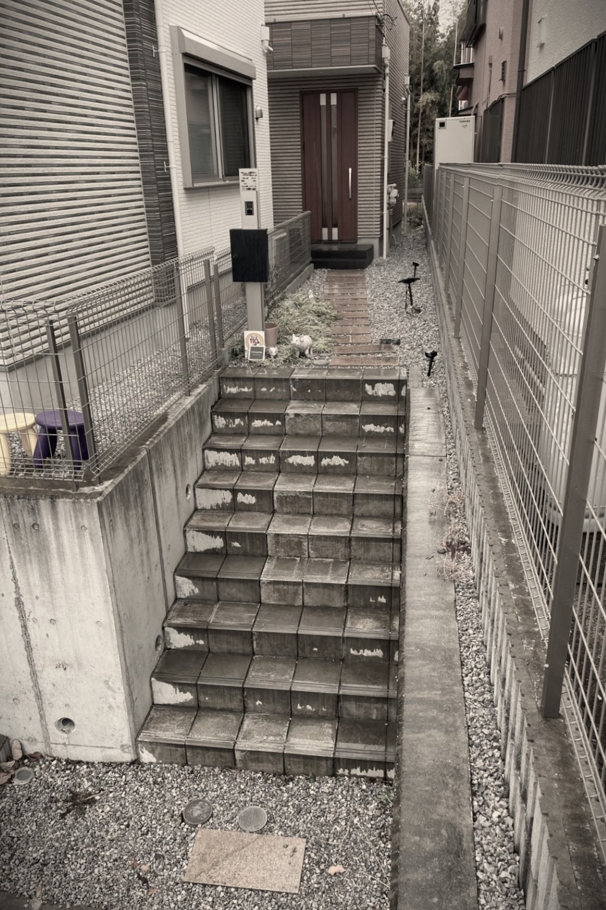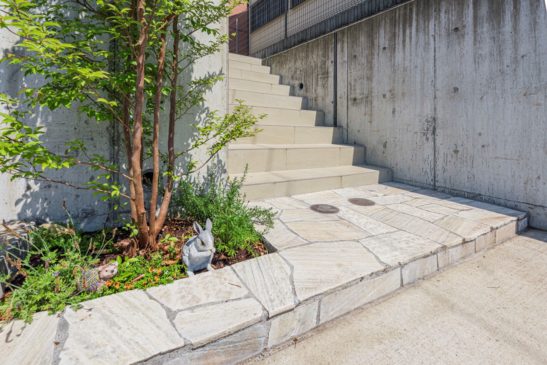 既存のアプローチにはコンクリート仕上げの階段と、その先から玄関にかけて砂利敷き×平板が置かれていました。