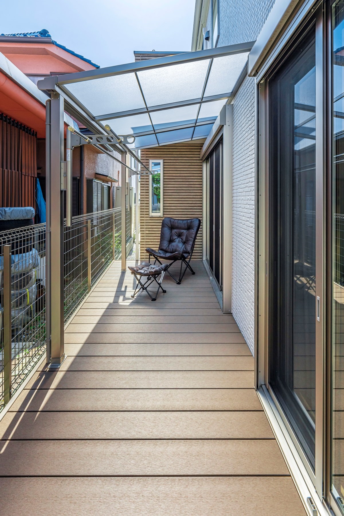 アプローチのほかに、テラス屋根付きのウッドデッキも施工しましたので、合わせてご覧ください。