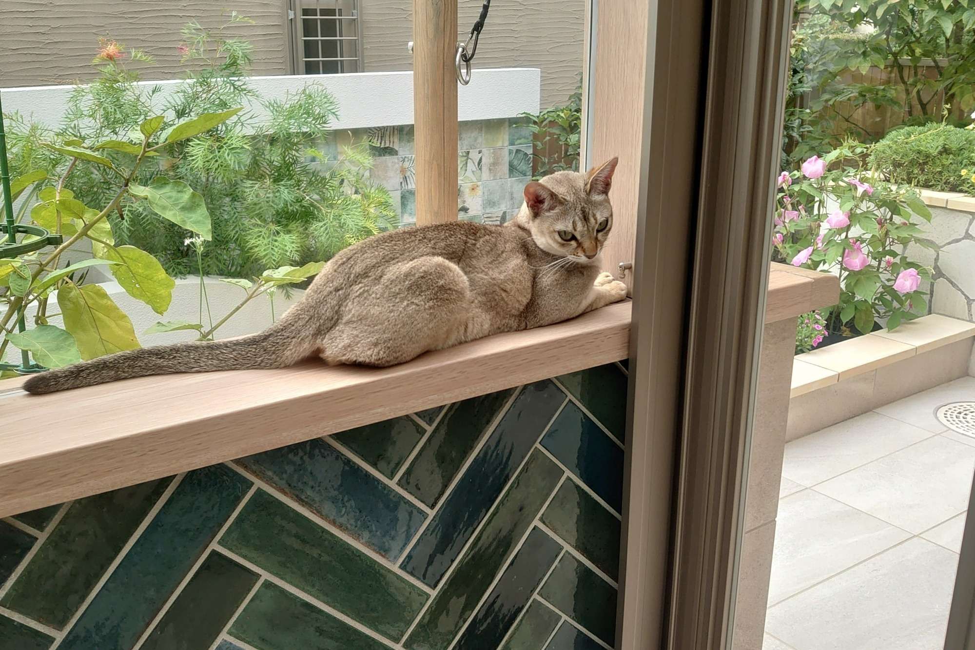 この場所は誰にも譲らない、と言わんばかりの表情で出迎えてくれた猫ちゃん。窓サッシが愛猫のお気に入りの場所のようです。この猫ちゃんの撮影は夏頃。外に出たくても暑くて嫌だなってときでも、エアコンの効いたガーデンルームがあるので、心地よく過ごしてくれているようです。