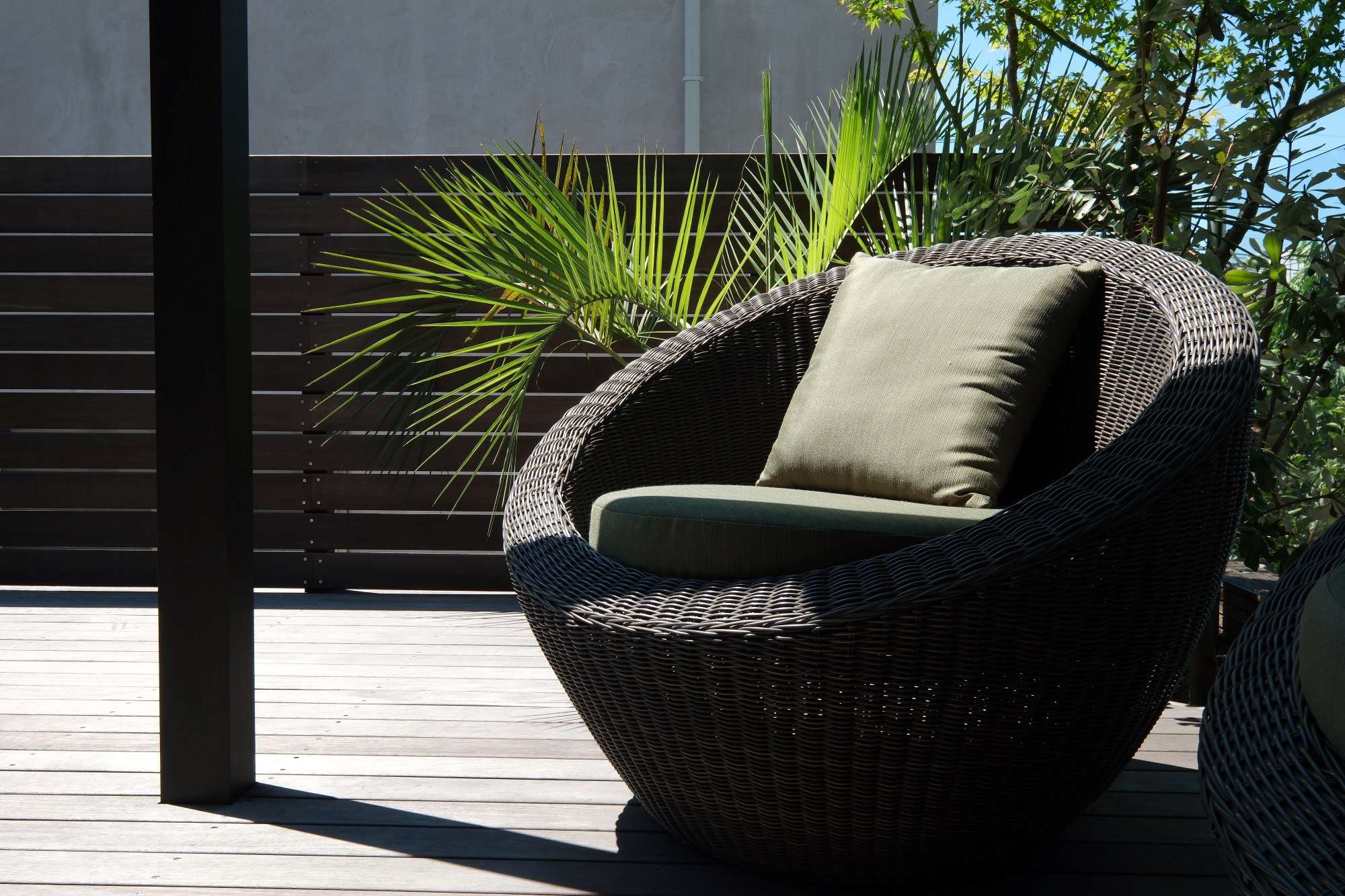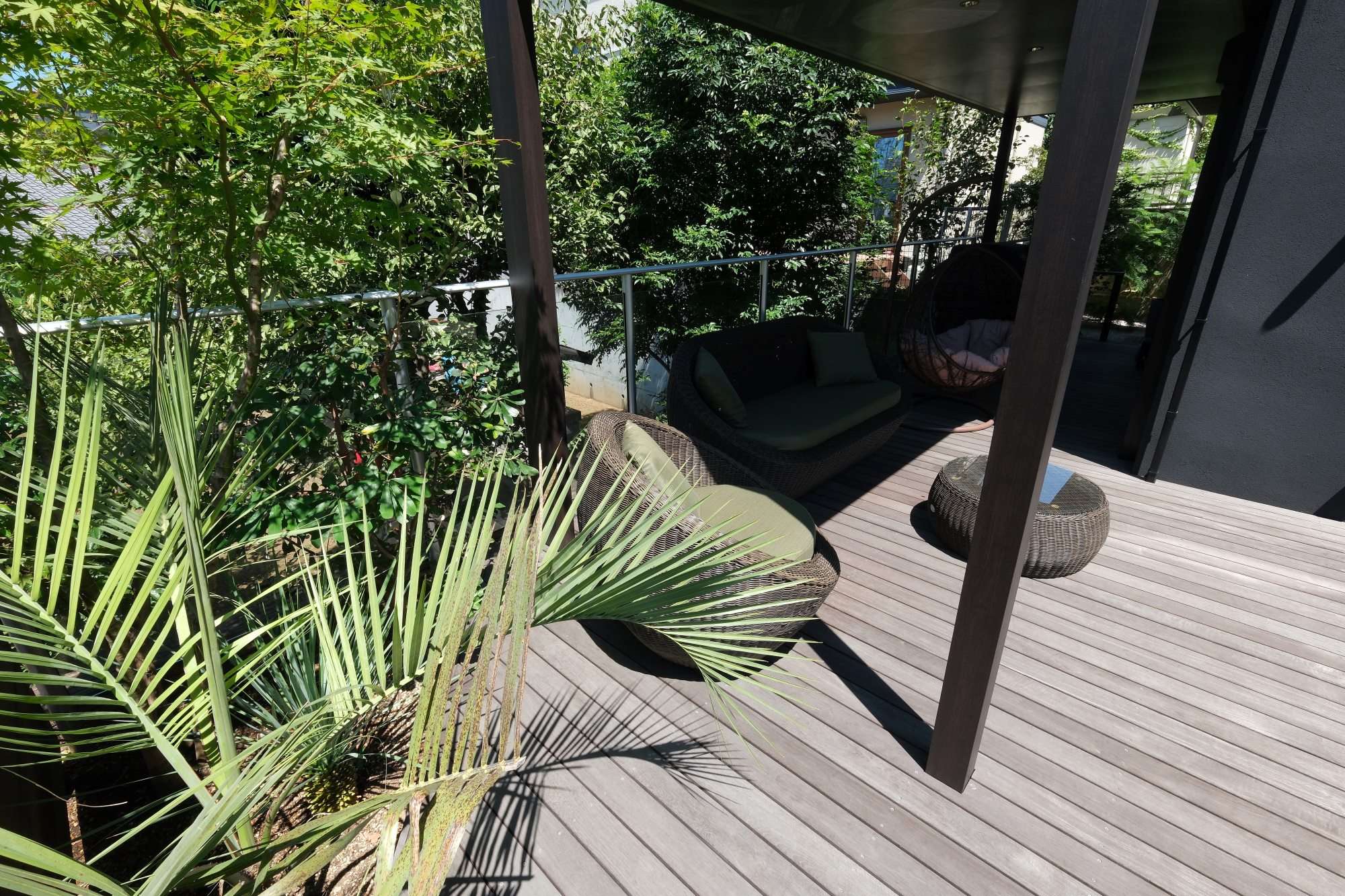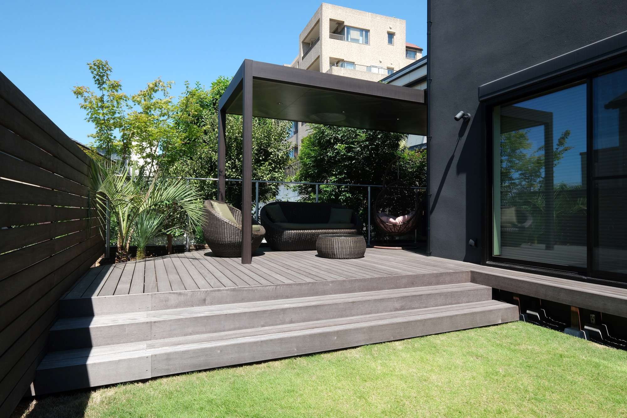 室内のバーカウンターからつながるお庭に、ウッドデッキを施工しました。また、デッキ上にホームヤードルーフも施工。ダウンライトの柔らかな灯りに包まれながら、お酒を楽しめるようにと。