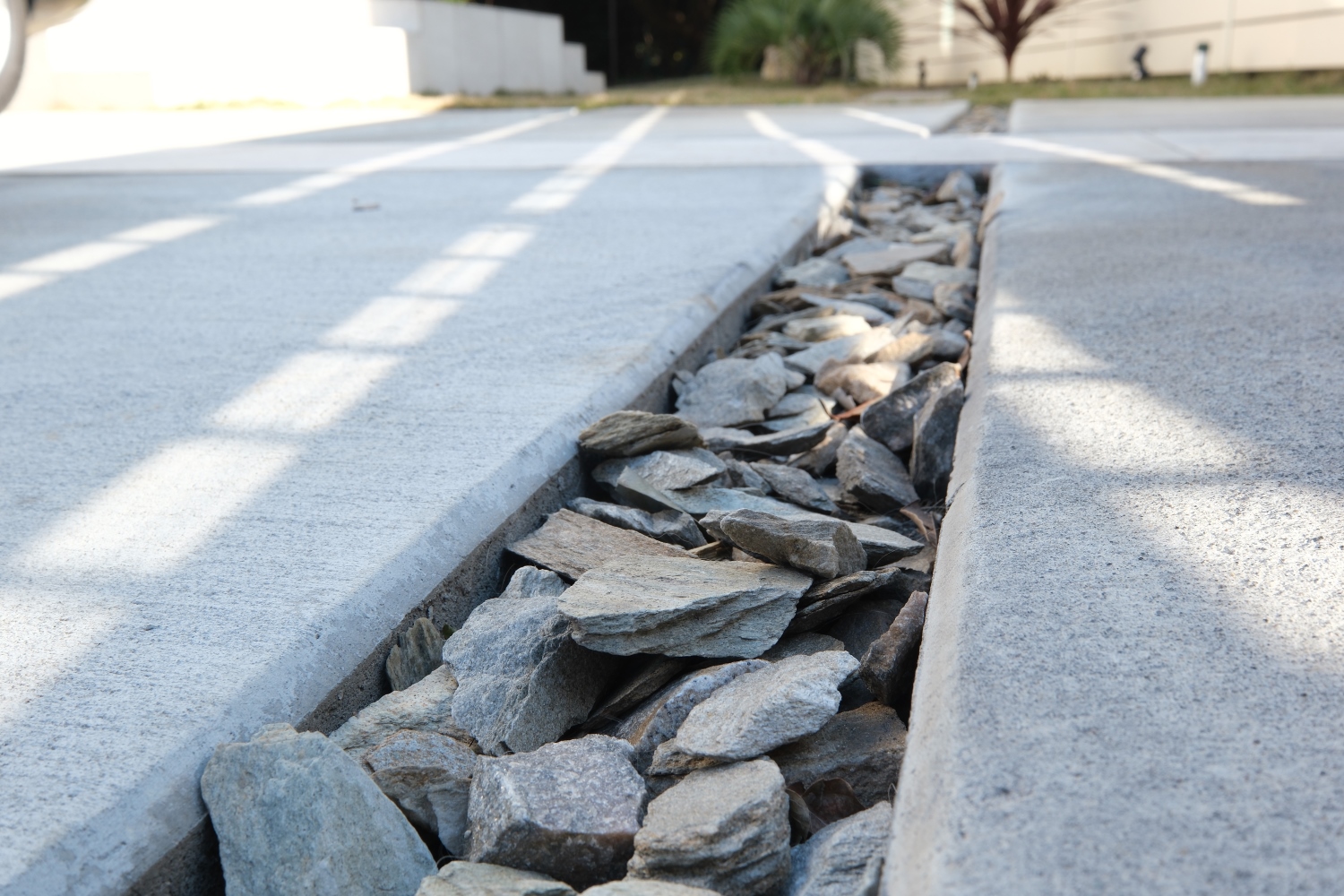 しかし今回は、愛犬がストッパー下の隙間から道路へ出ない工夫が必要だったり、セットバックでは庭の有効スペースを狭めてしまうため、ドアの下りる軌道に添った位置に溝を施工し対応しております。