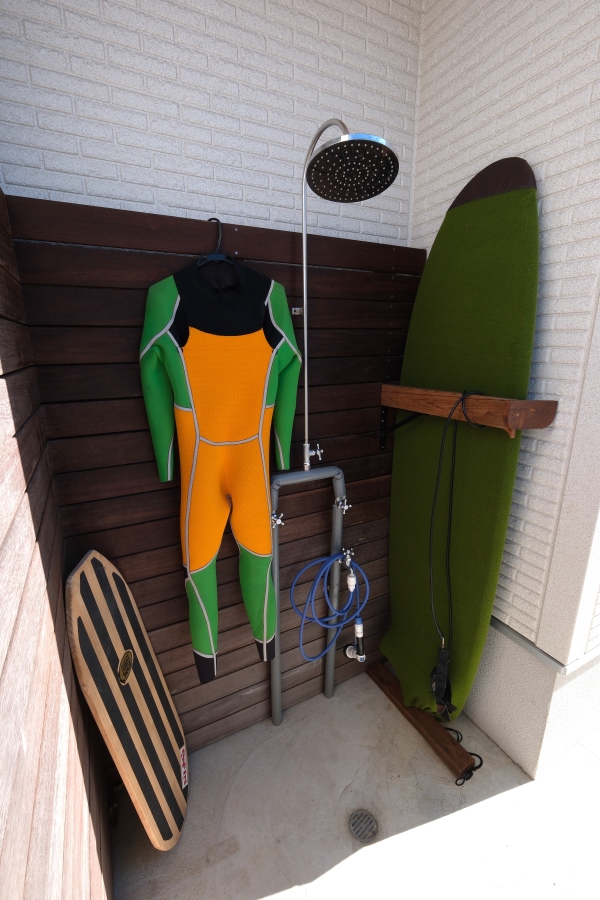 写真中央の壁は正面からのアクセント壁兼、サーフィン帰りのシャワーブースの仕切としています。
