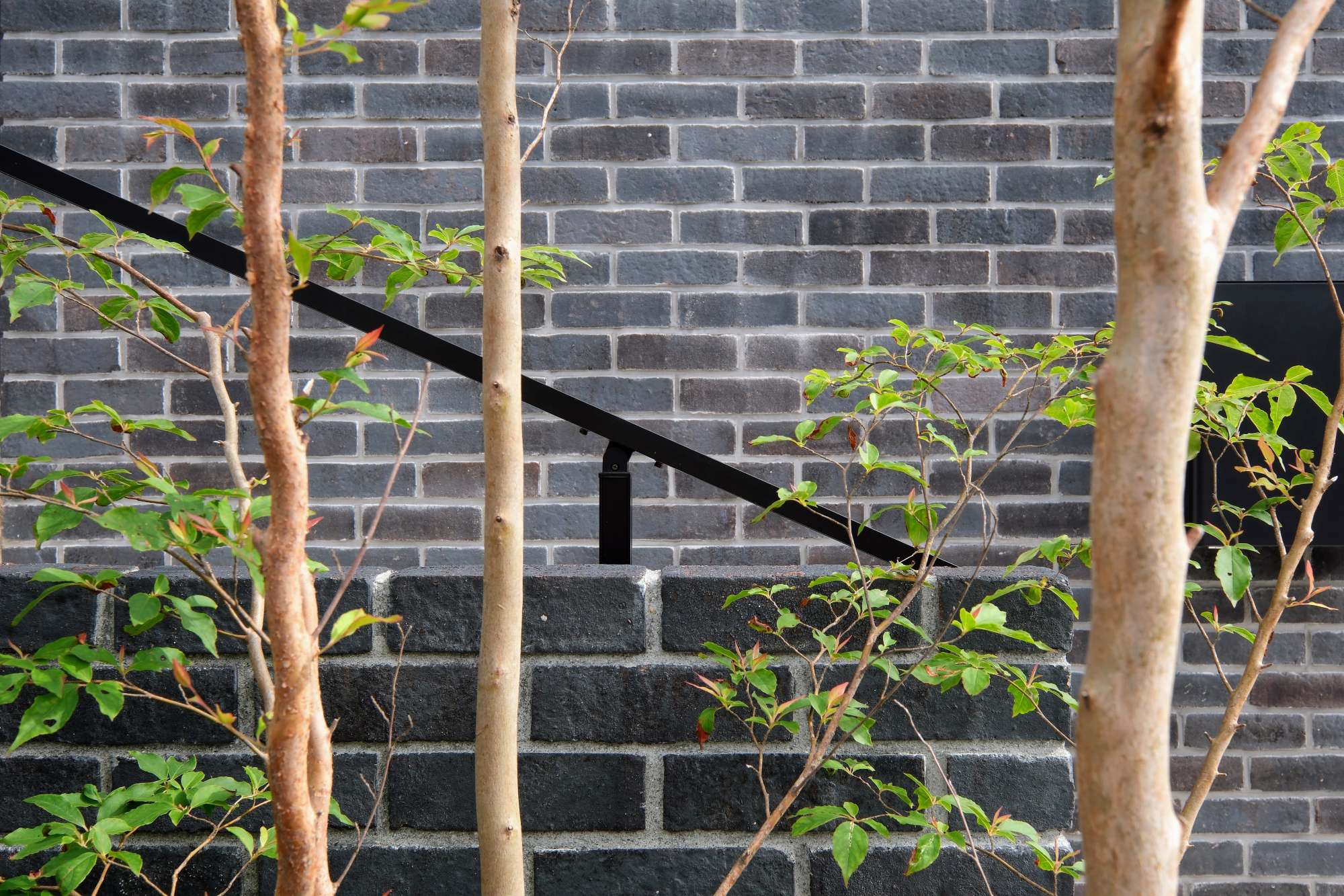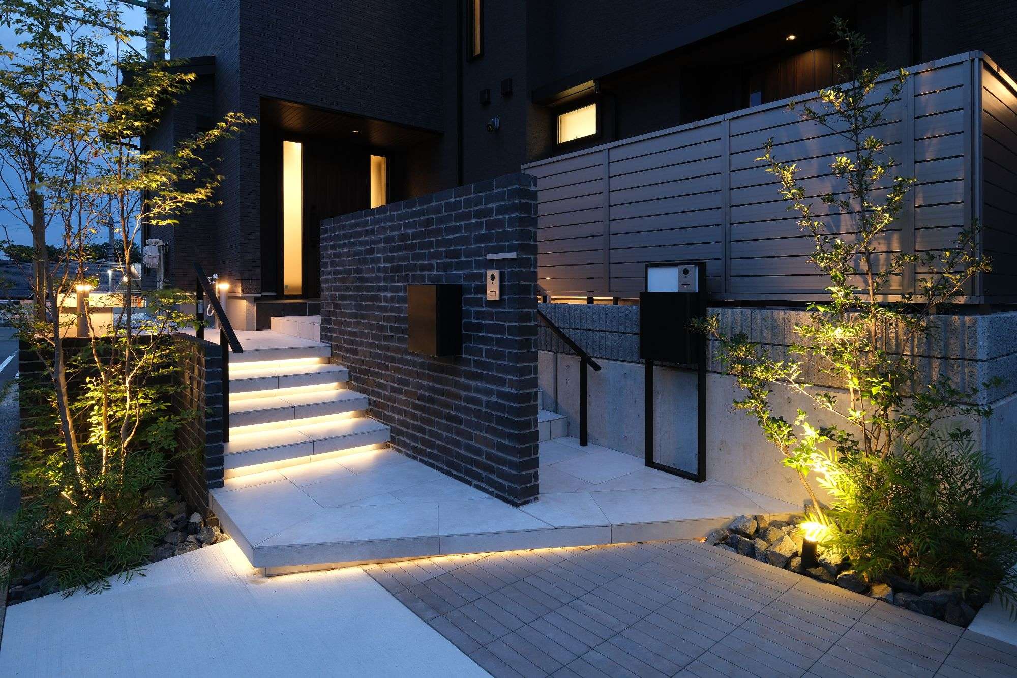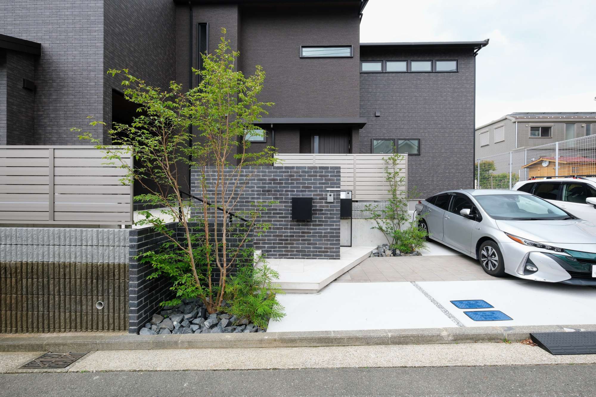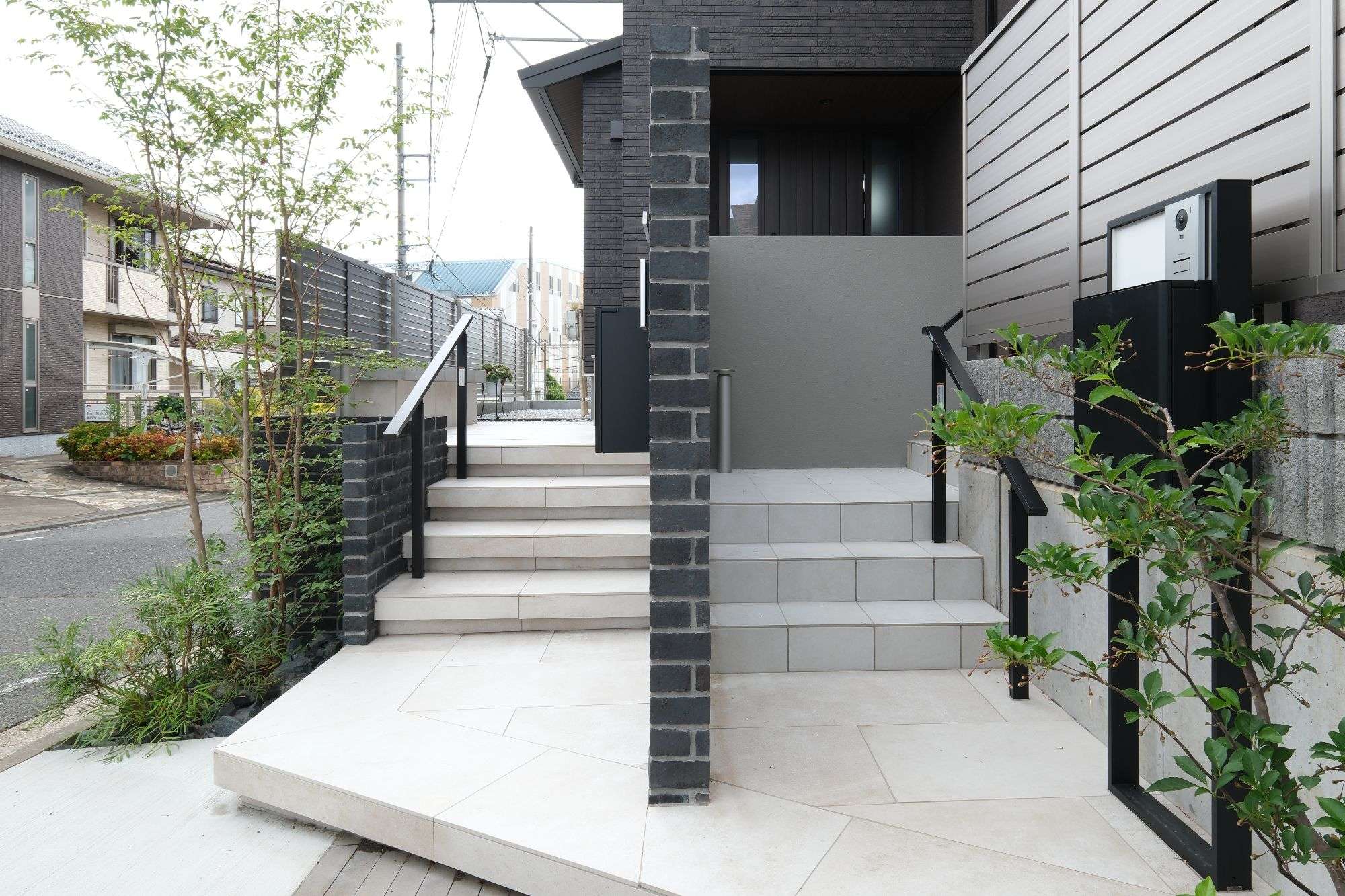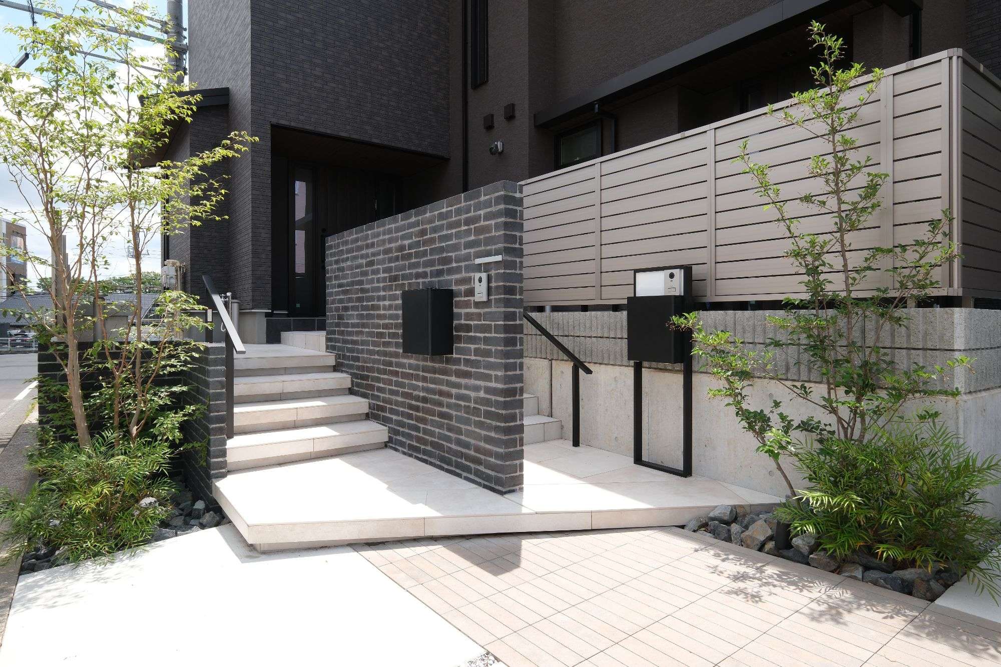 レンガ張り門柱と大判タイルアプローチのある二世帯住宅