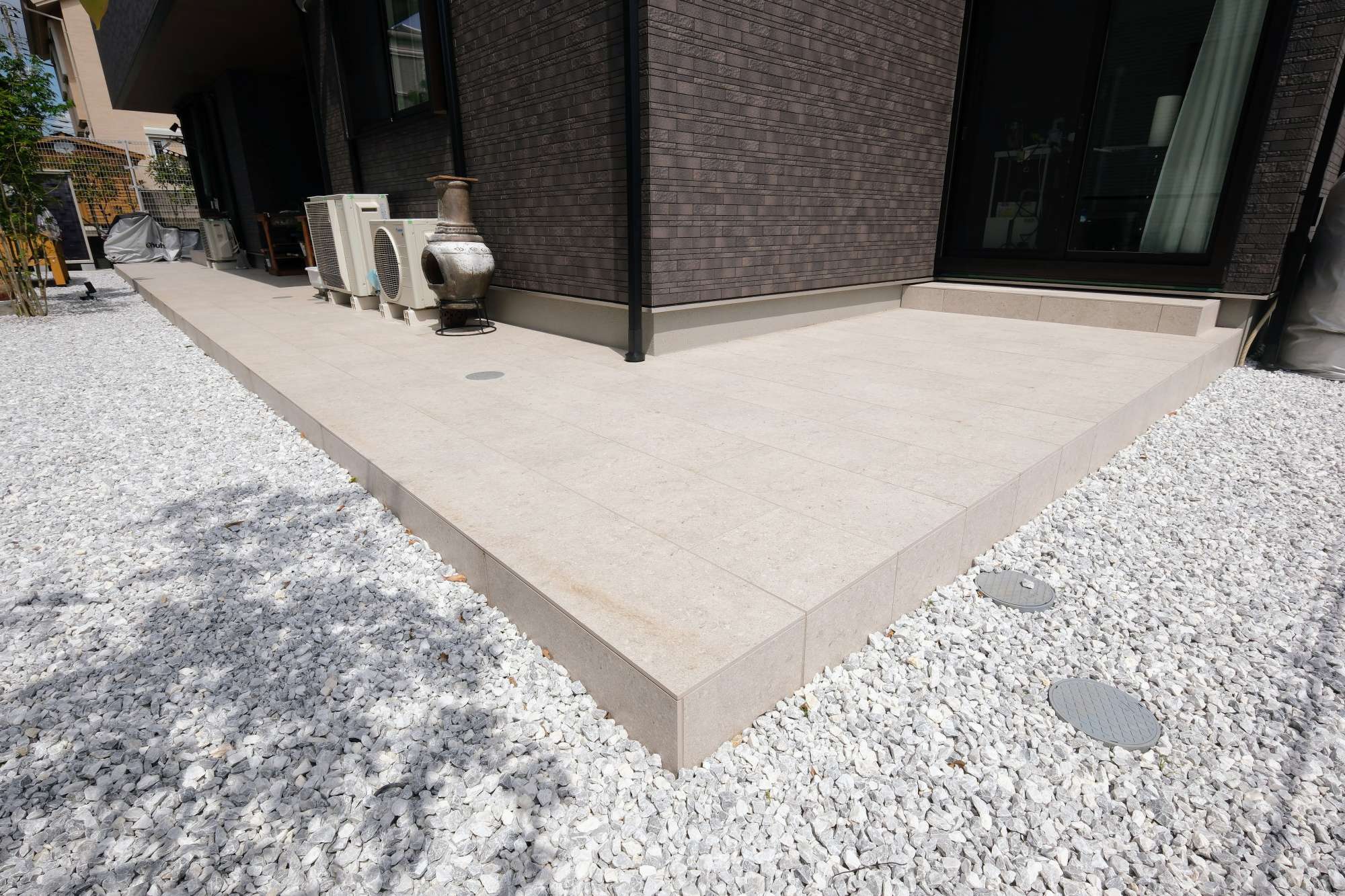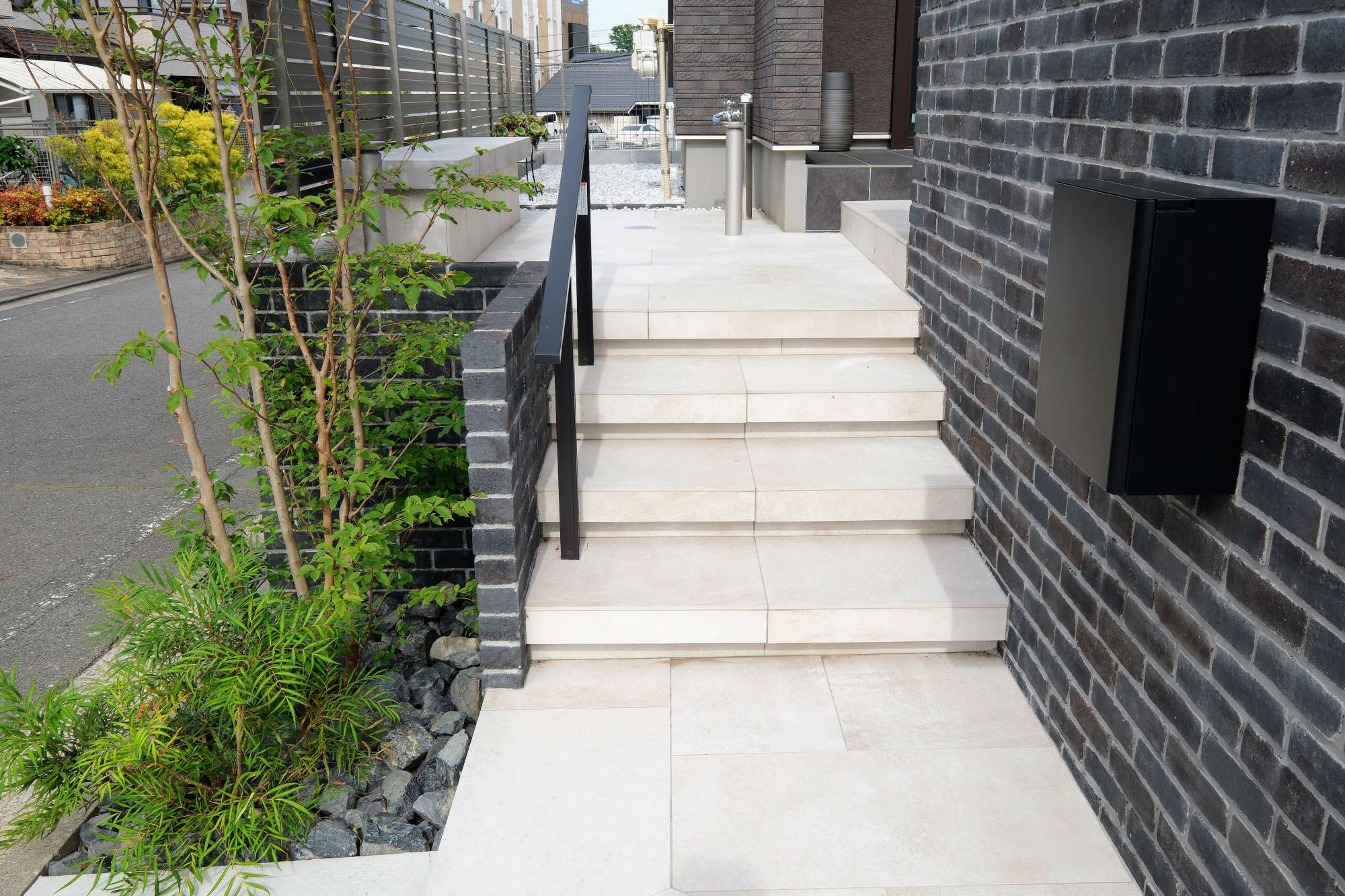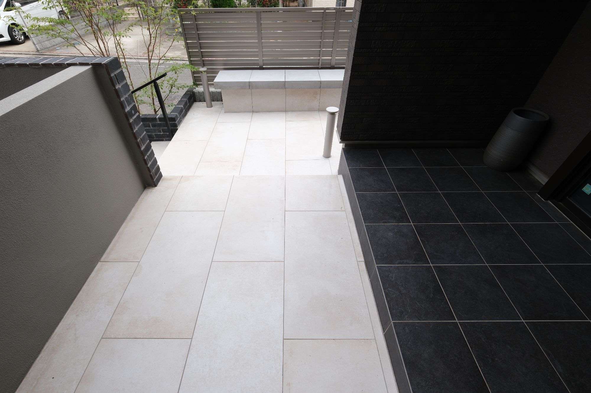 900×450角の大判タイル(ニッタイ工業のマンハッタン)を採用したアプローチ階段。間口は1300mm程度確保し、ゆとりのあるアプローチを計画。階段上がった左側にはベンチを造作し、愛犬の足を洗ったり、小休憩できるような場所になるよう工夫しました。