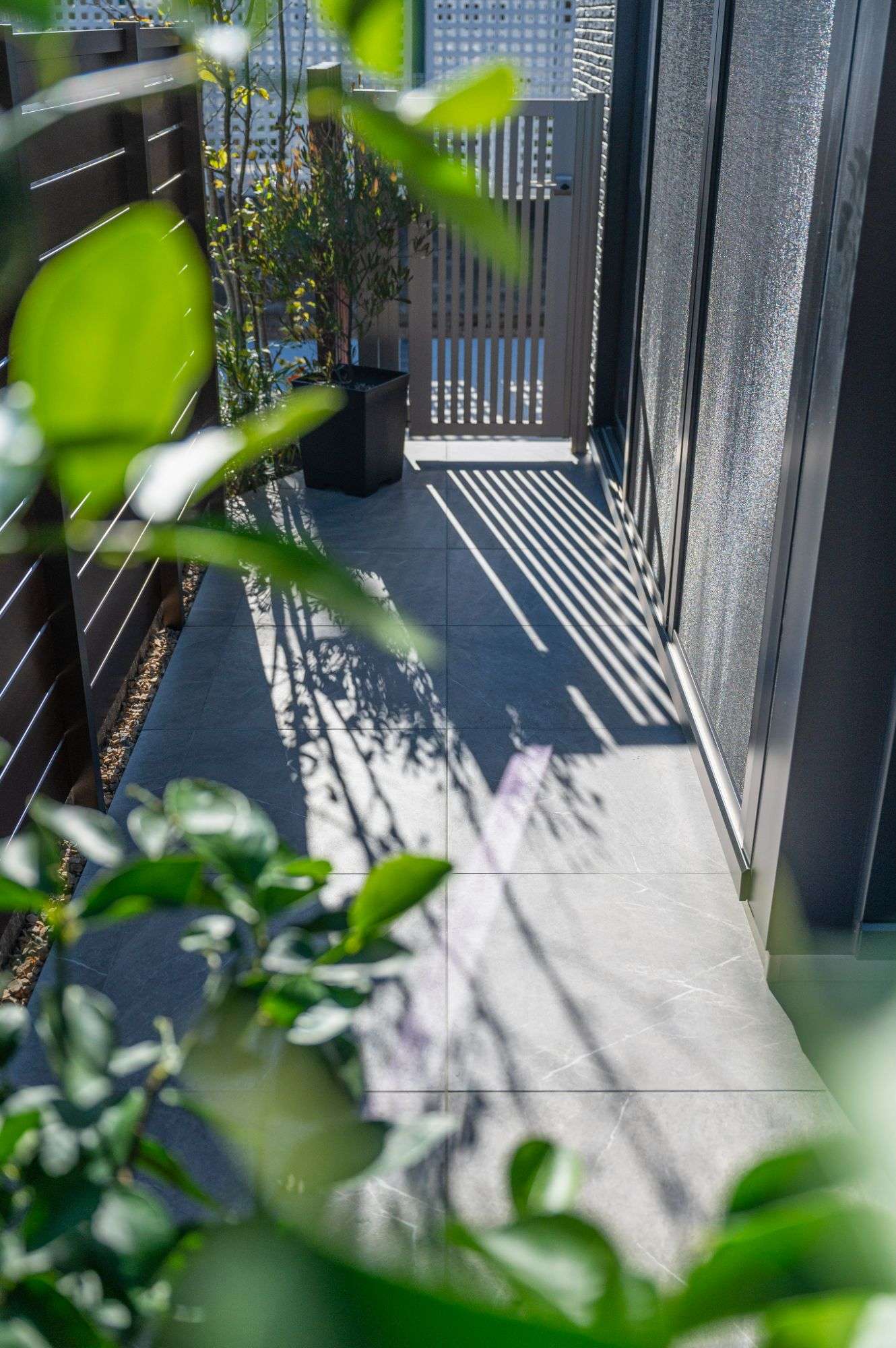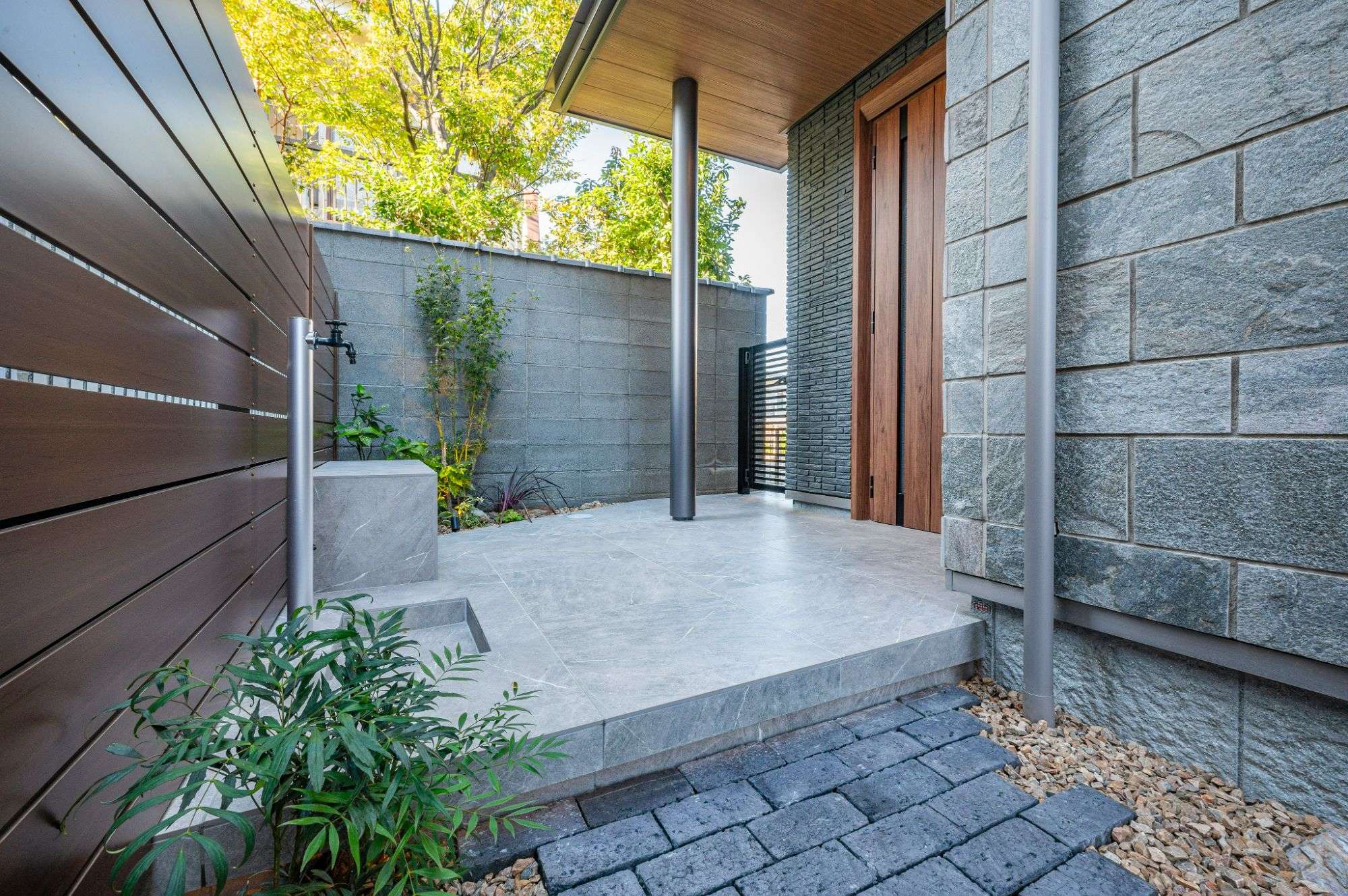 奥に玄関を設けたお建物の為、玄関ポーチは、広めのタイルテラスとベンチ、水栓、坪庭で明るい空間となるよう、プランしました。