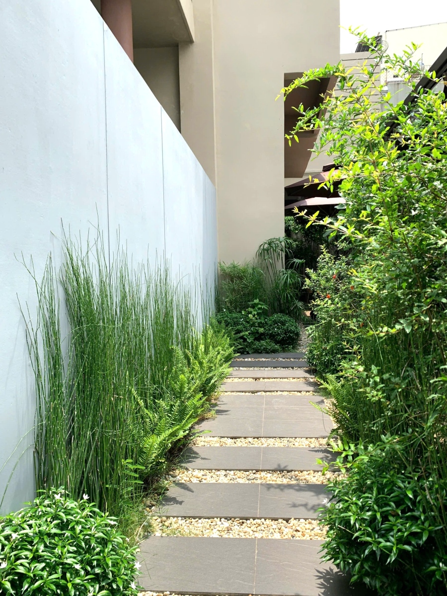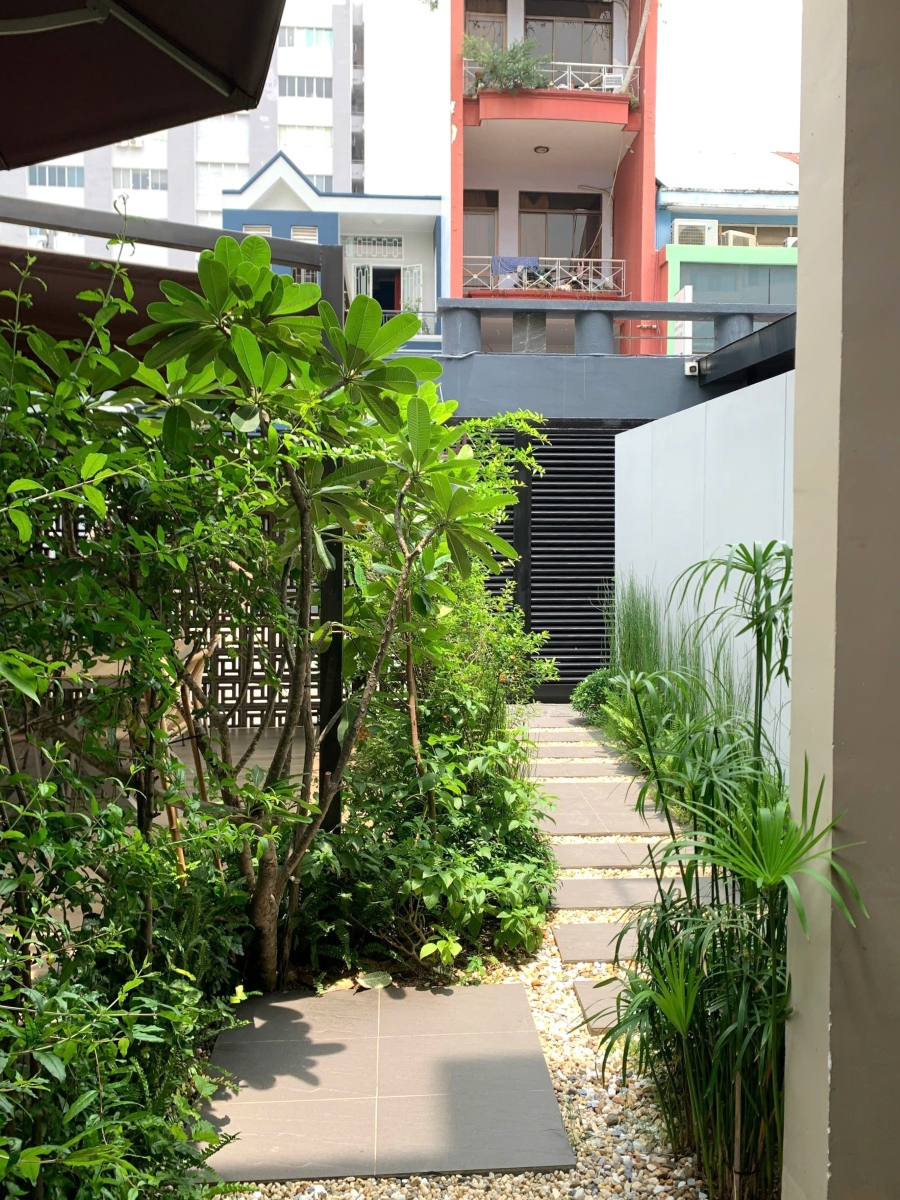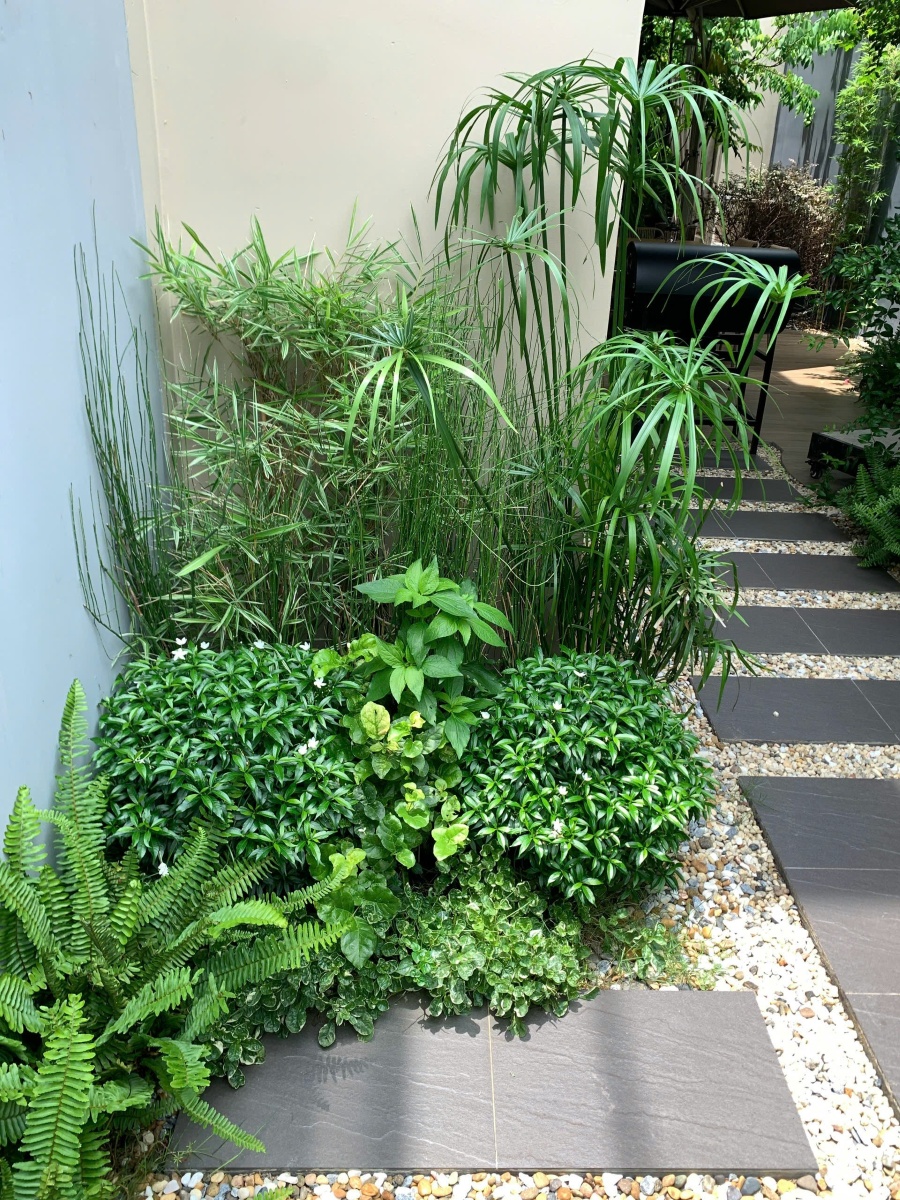 和の趣を感じさせるような植栽を選んでいるのですが、場所がホーチミンと日本よりも温暖な気候とあり、全く日本と同じといきません。そんな条件ではありましたが、トクサやタマシダ、メダケ系の植栽を用いてまとめています。東南アジアの趣も合いまったこの感じがとても好きです。