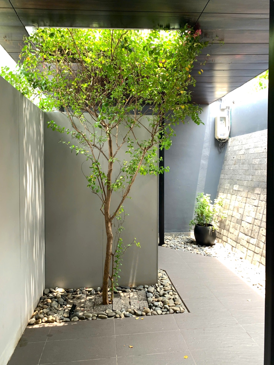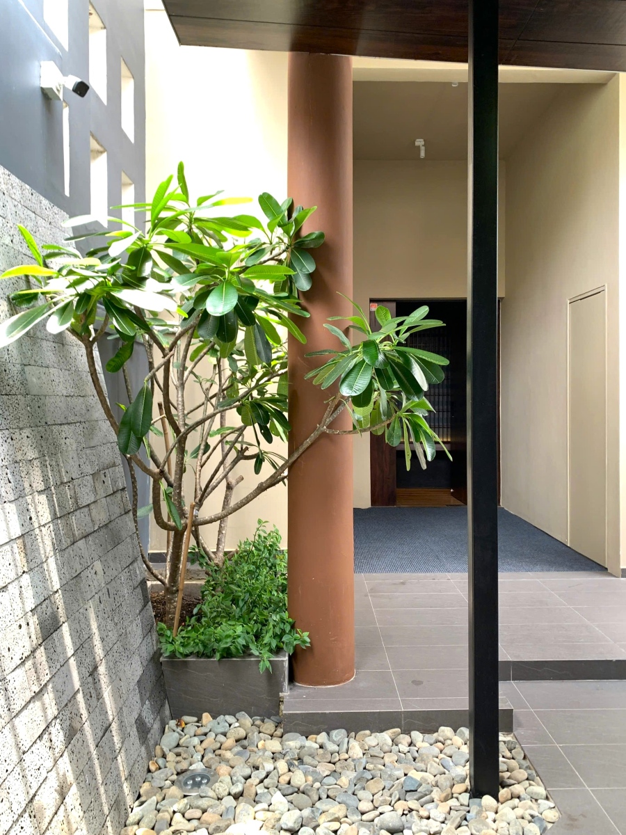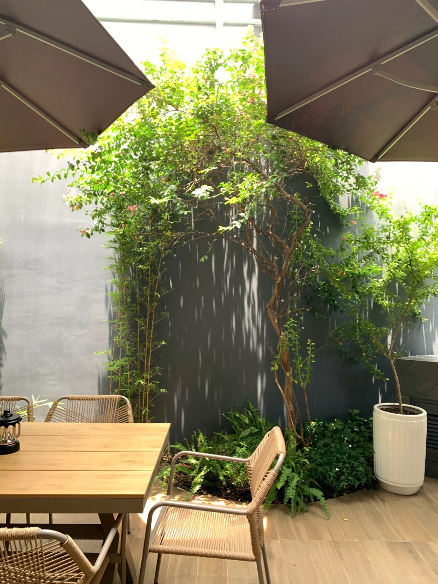 和の趣を感じさせるような植栽を選んでいるのですが、場所がホーチミンと日本よりも温暖な気候とあり、全く日本と同じといきません。そんな条件ではありましたが、トクサやタマシダ、メダケ系の植栽を用いてまとめています。東南アジアの趣も合いまったこの感じがとても好きです。