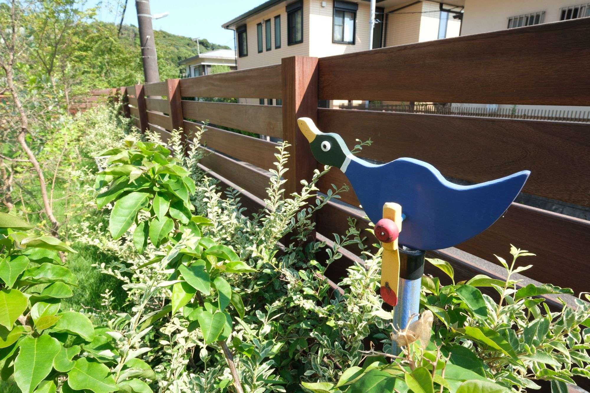 スウェーデンハウスの暖色の装いに合わせ、外構もハードウッドのウリン材で色を重ねました。