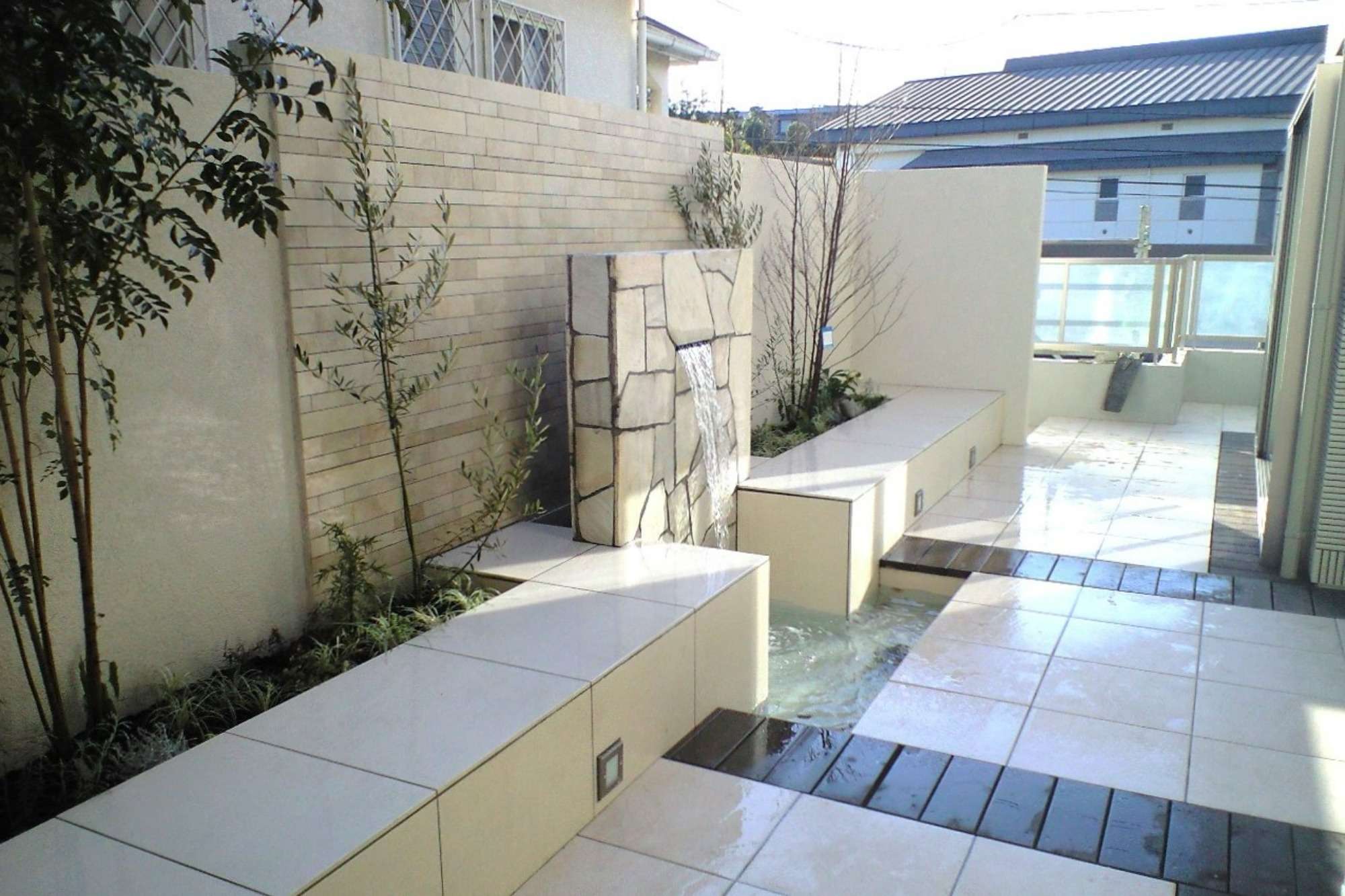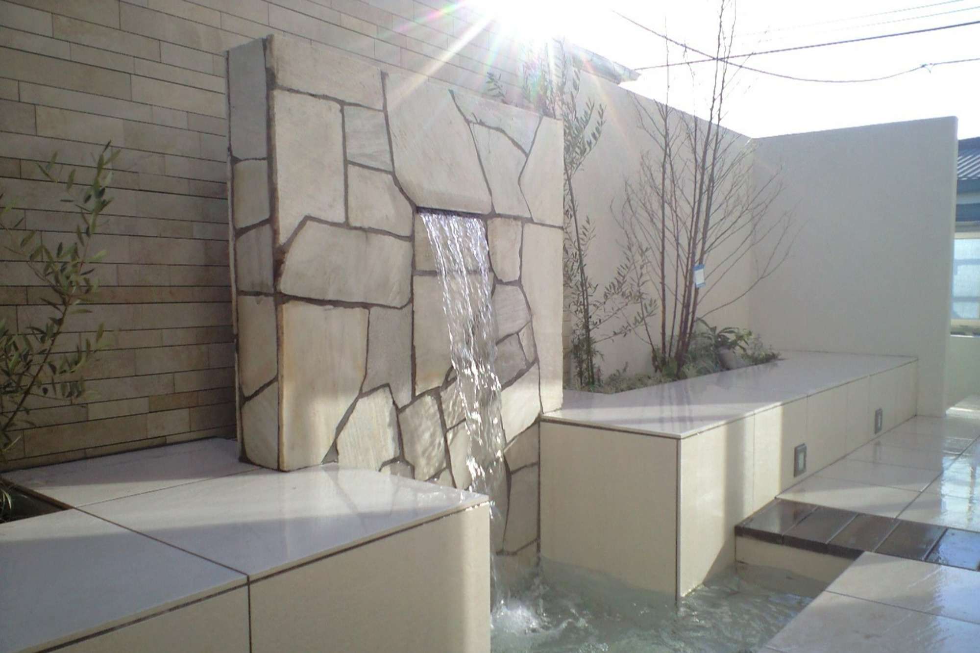 中庭通路を抜けると正面に堂々と壁泉が構え、まるでホテルに訪れた感覚になります。