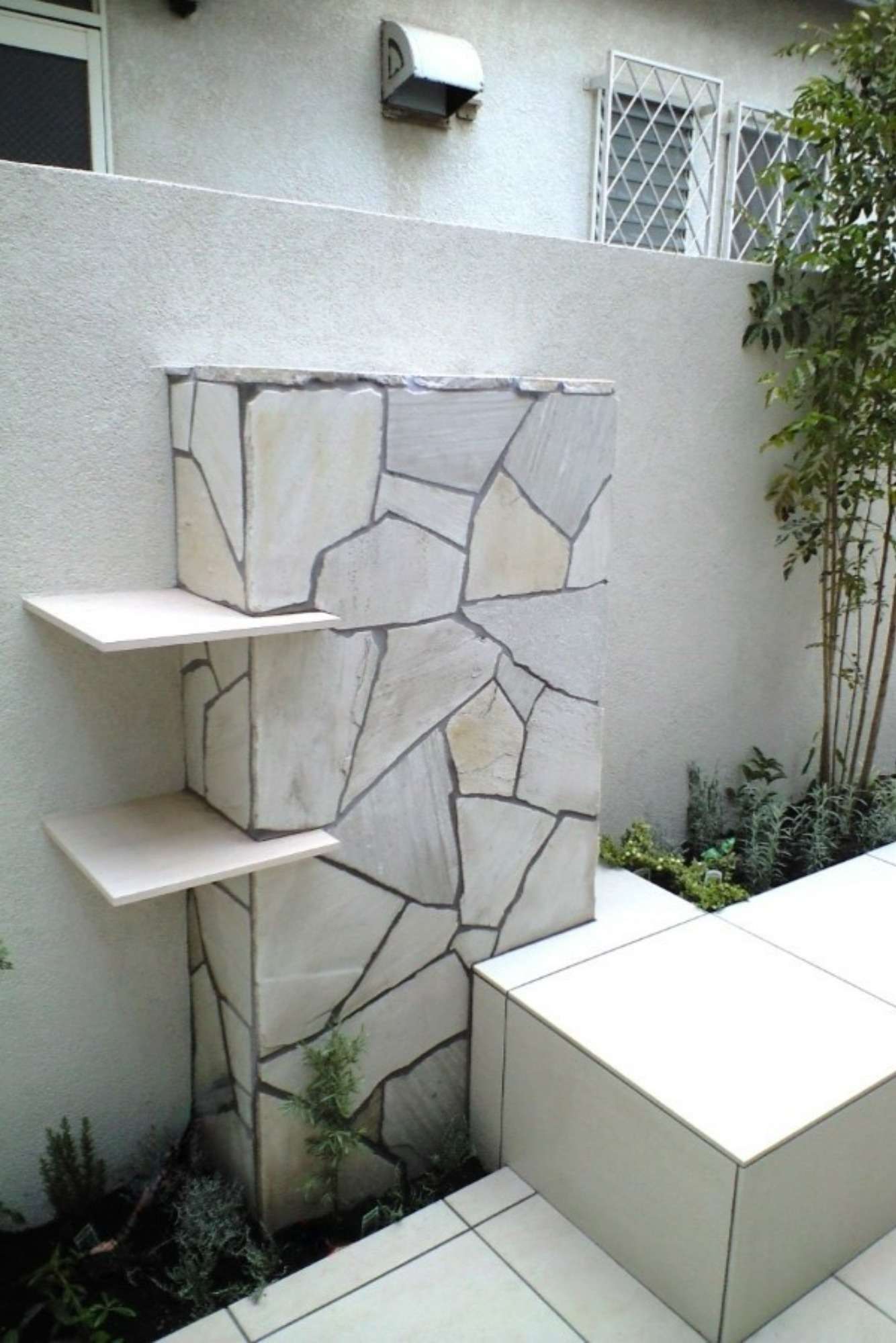泉の壁には自然乱形石、裏にはボーダータイル貼りの壁を施工し、