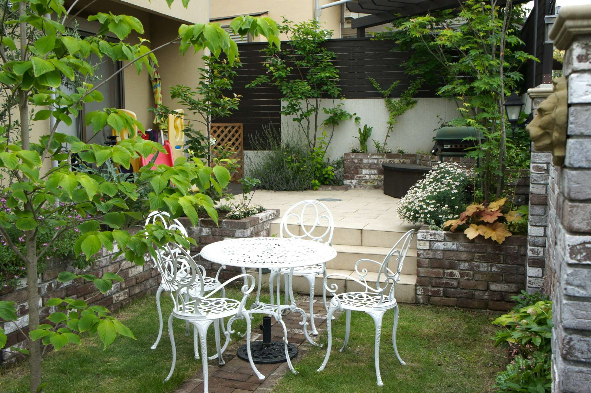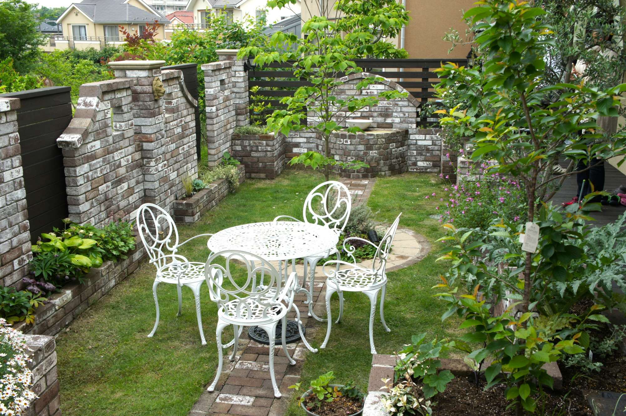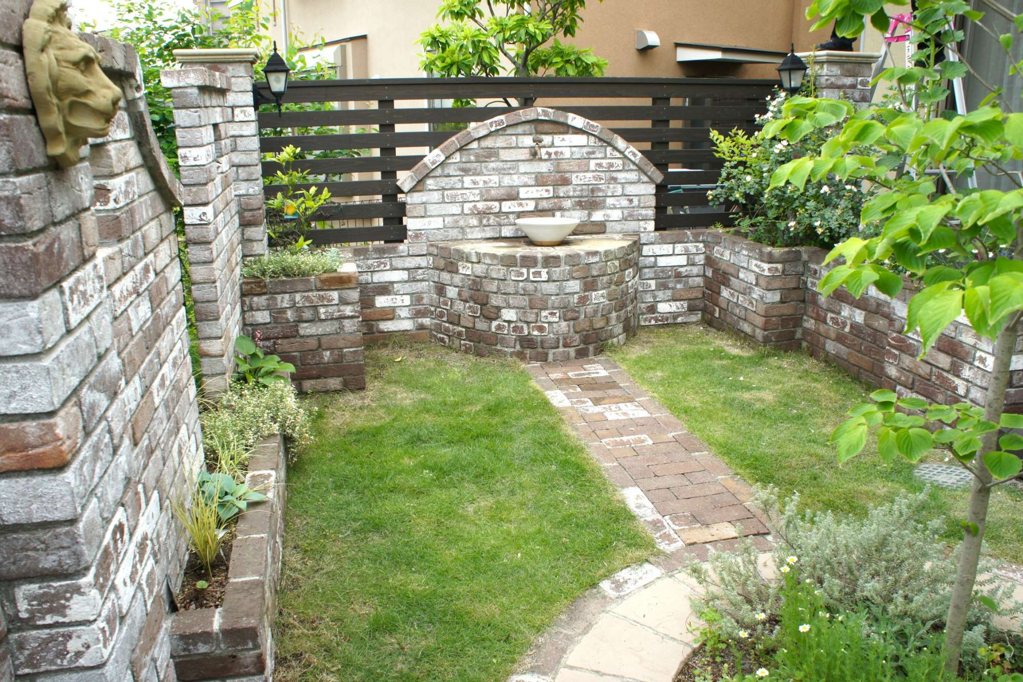 レンガ壁がイギリスの石積みを思わせる風合いをもち、落ち着いた雰囲気のお庭を演出してくれています。