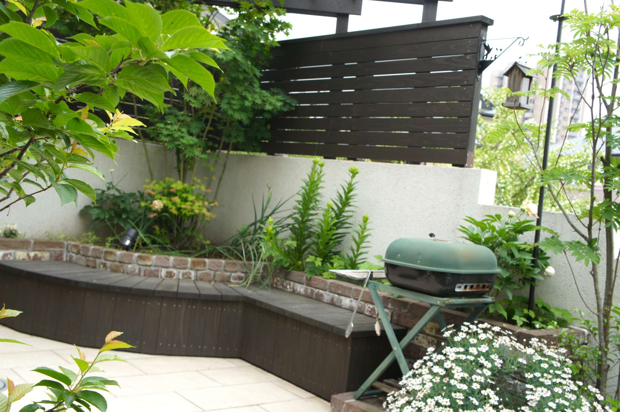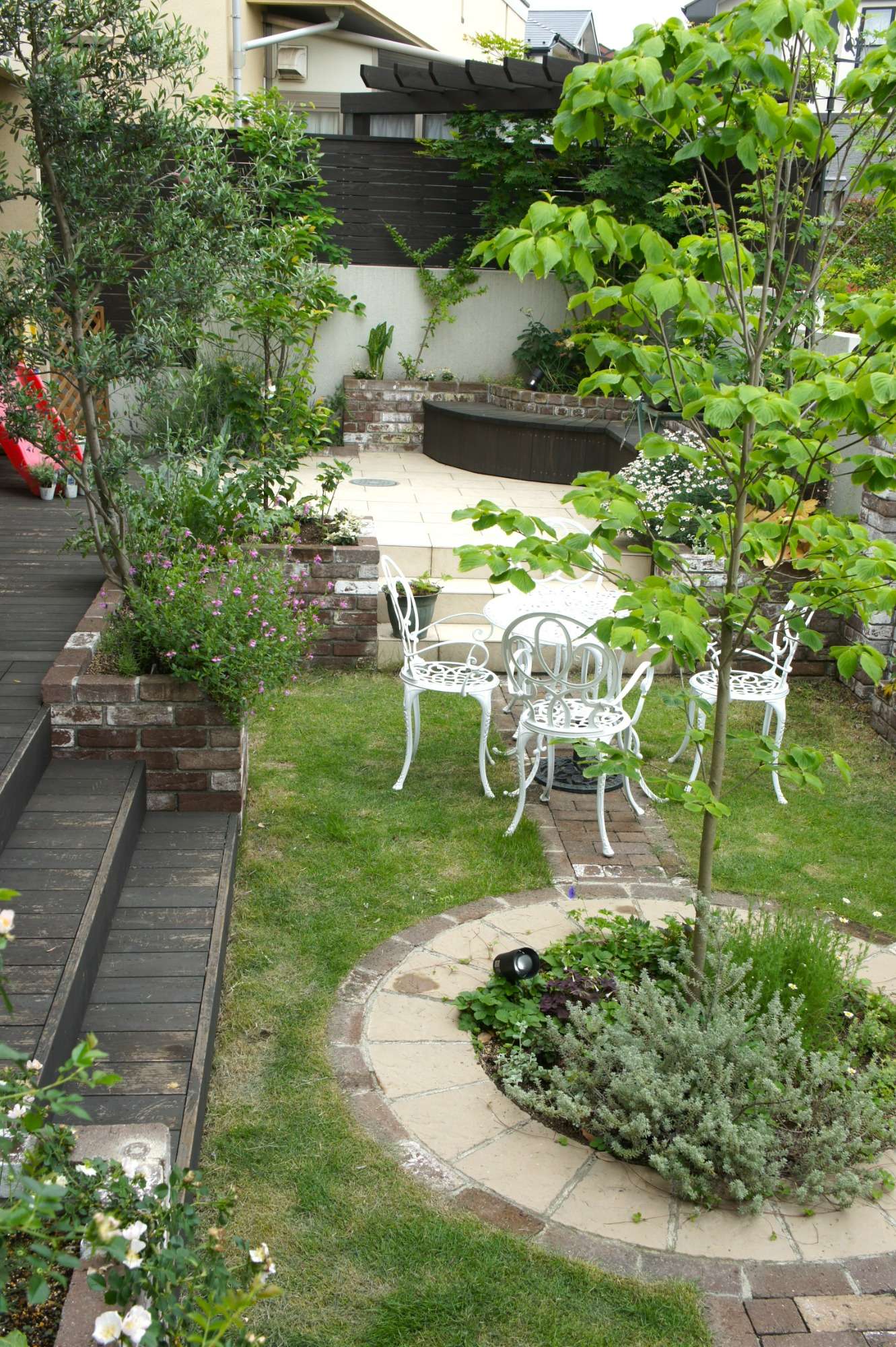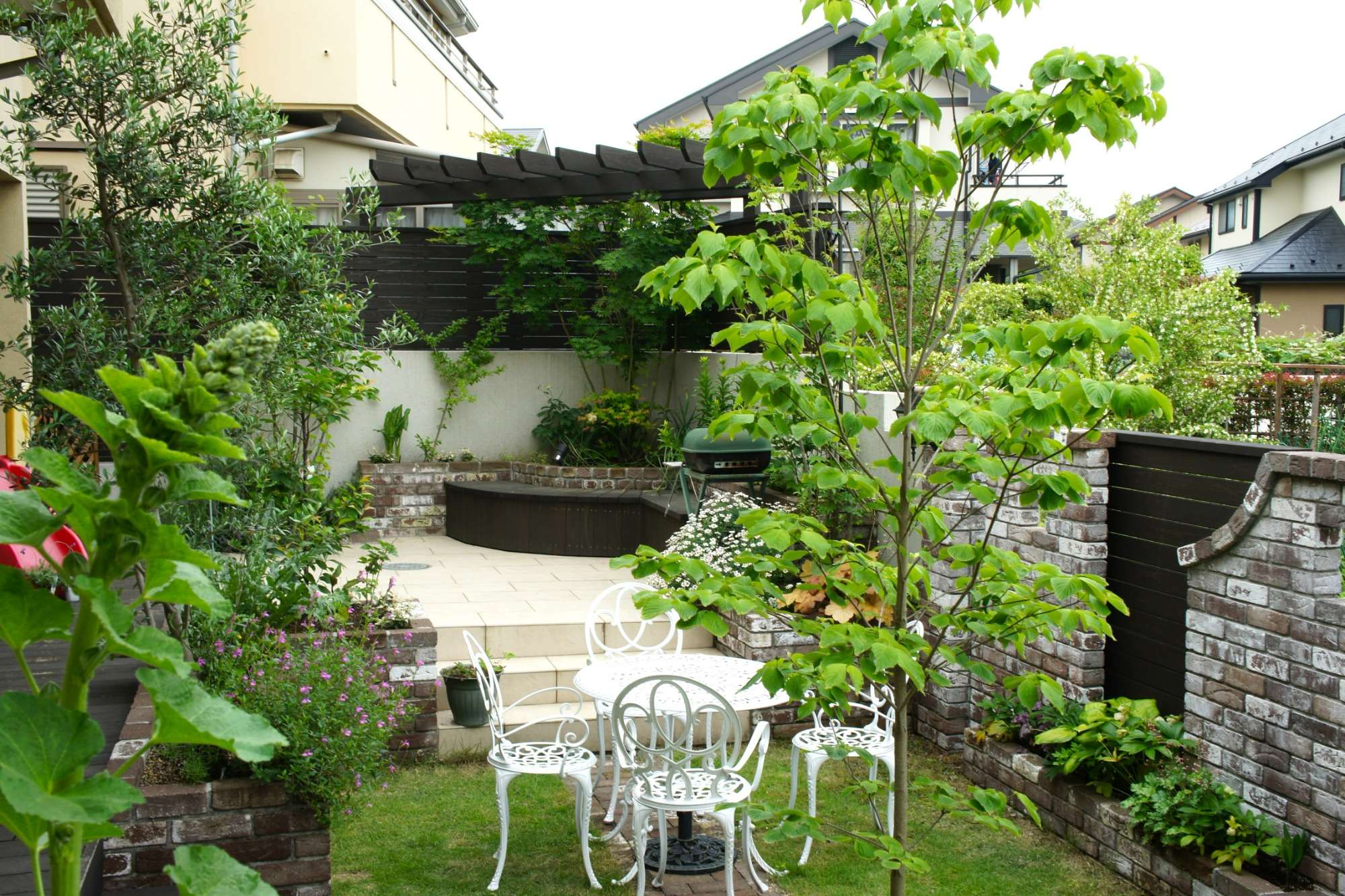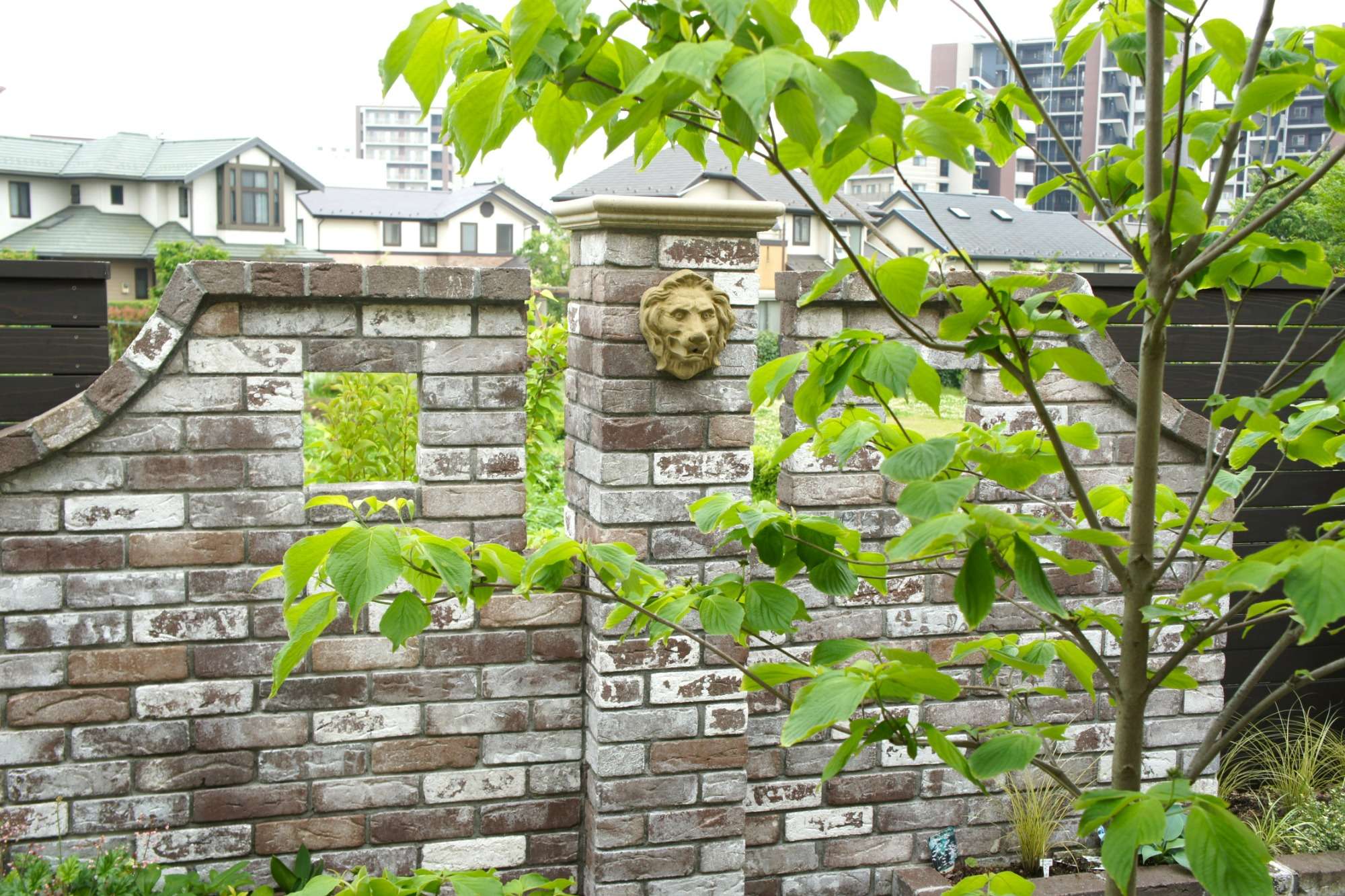 レンガ壁がイギリスの石積みを思わせる風合いをもち、落ち着いた雰囲気のお庭を演出してくれています。