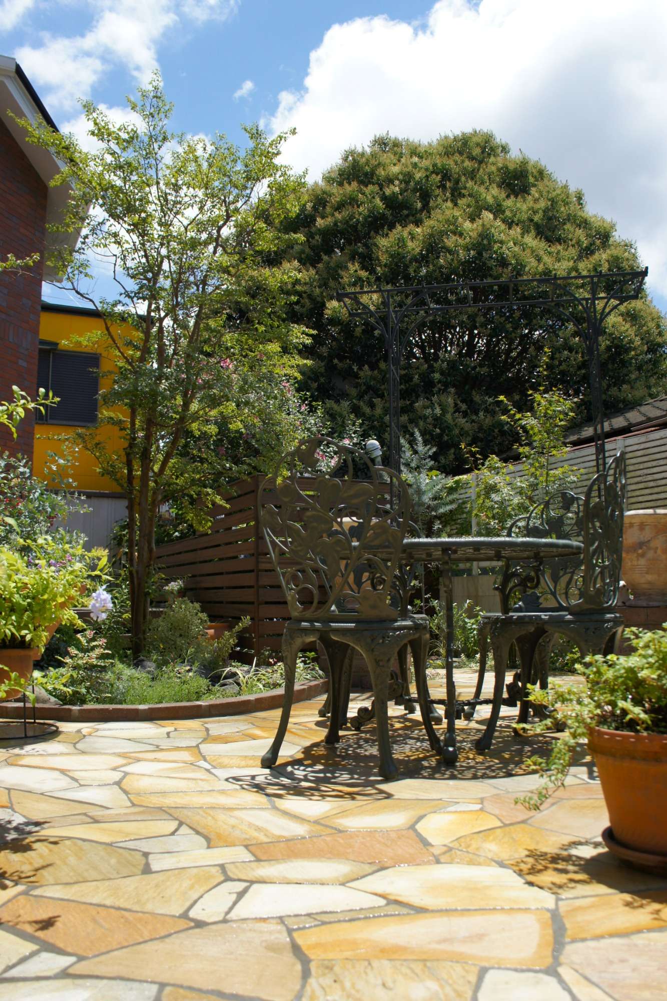 床は自然石を一面に貼り、お隣境界をウッドフェンスで囲いました。
