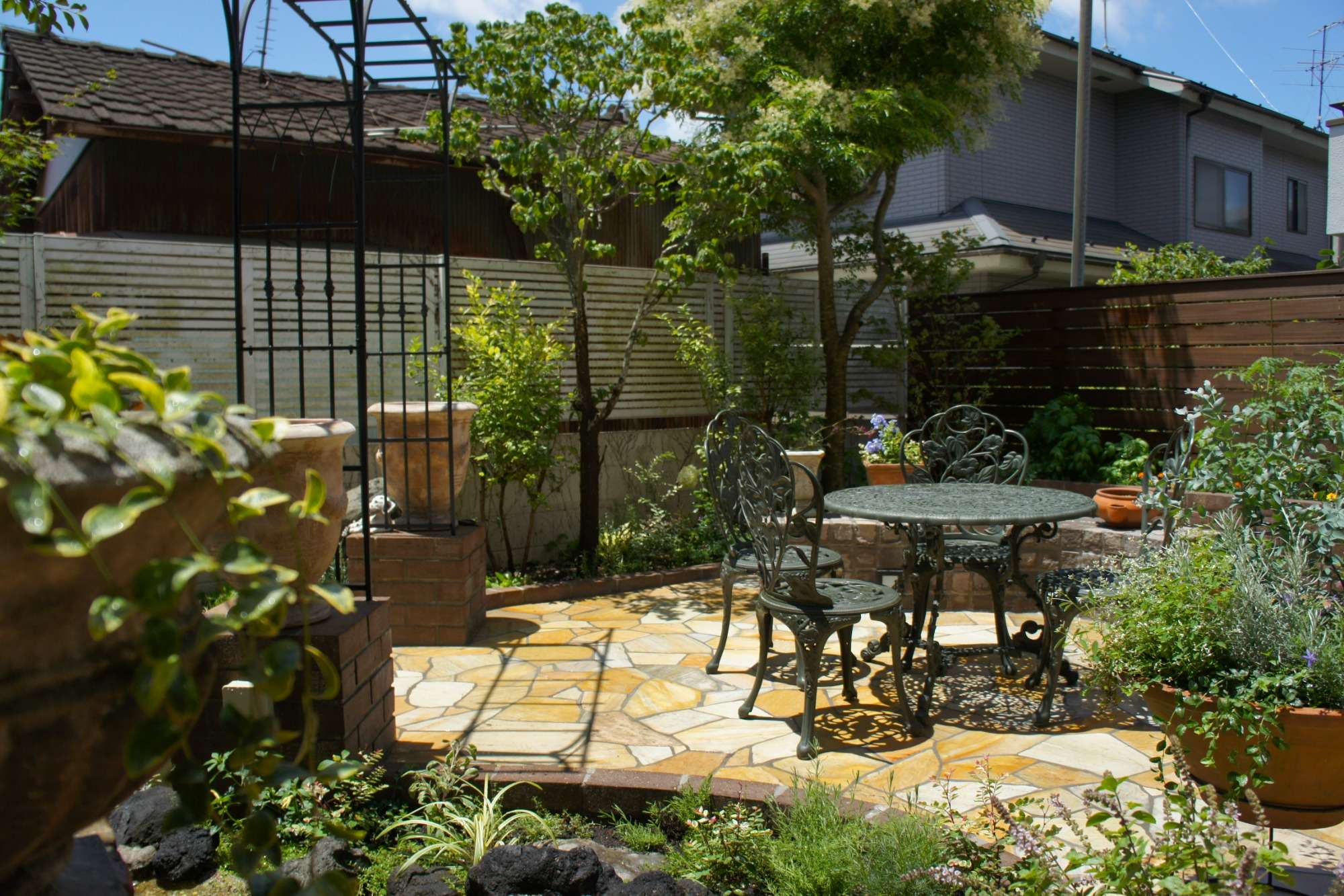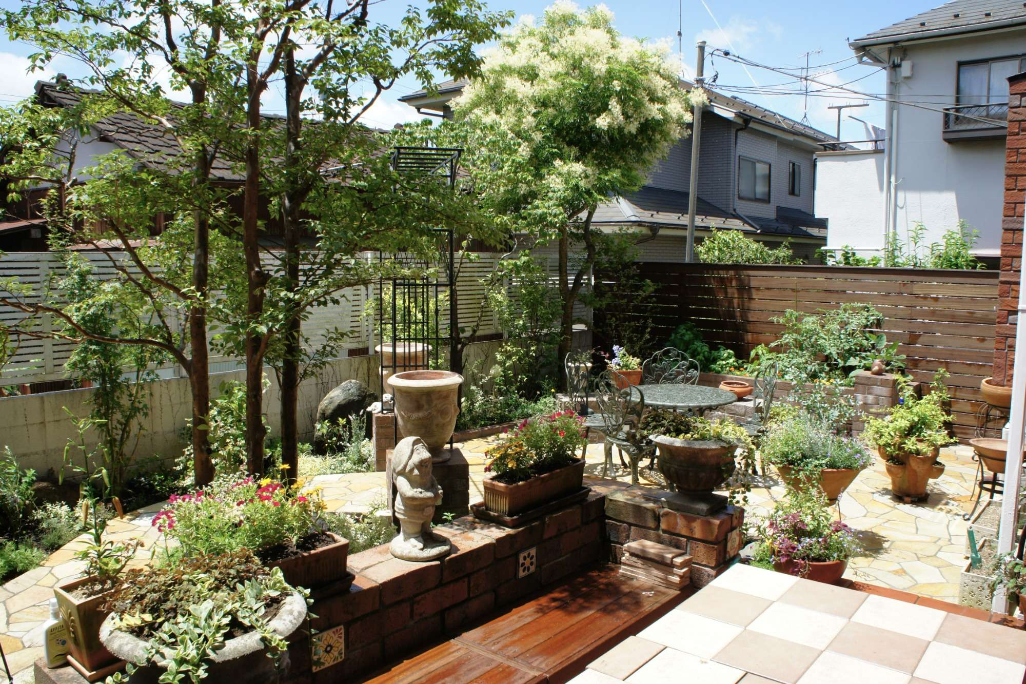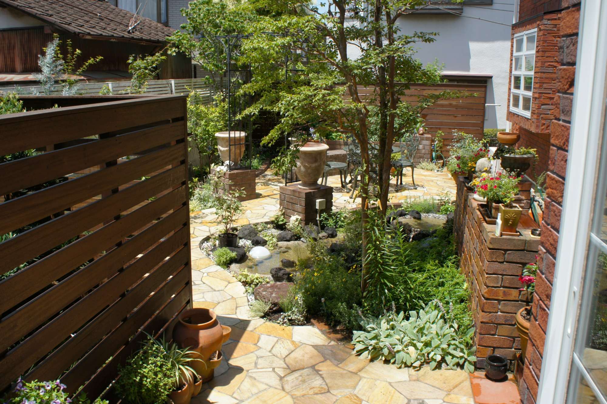 植栽は池の中やレンガの花壇、テラコッタ製鉢、植木等、配植を多く設けました。