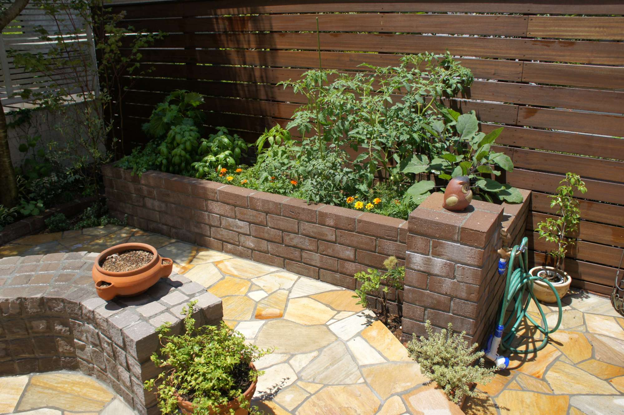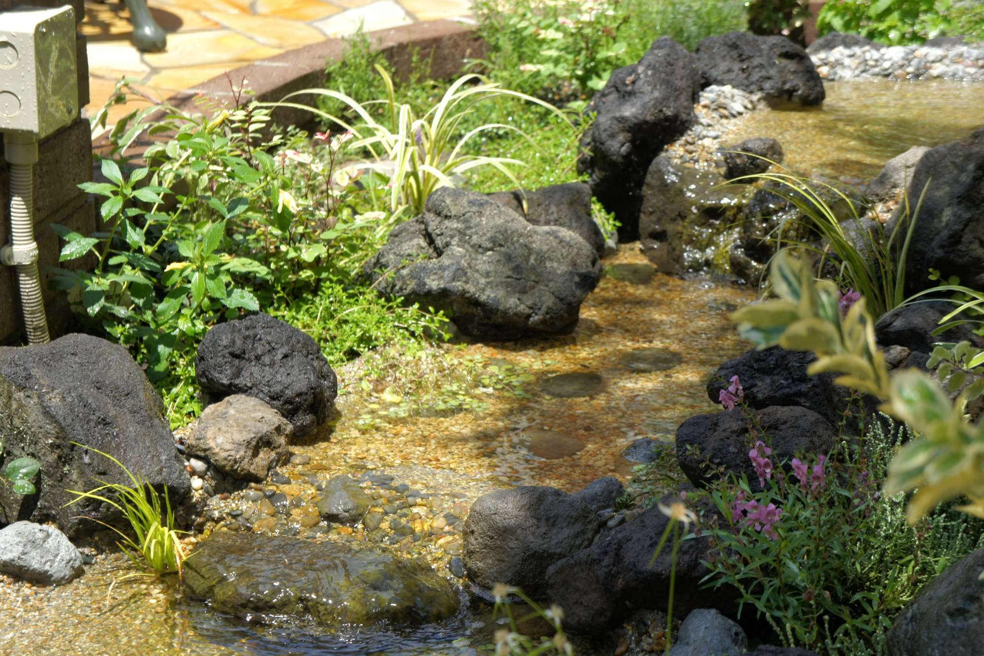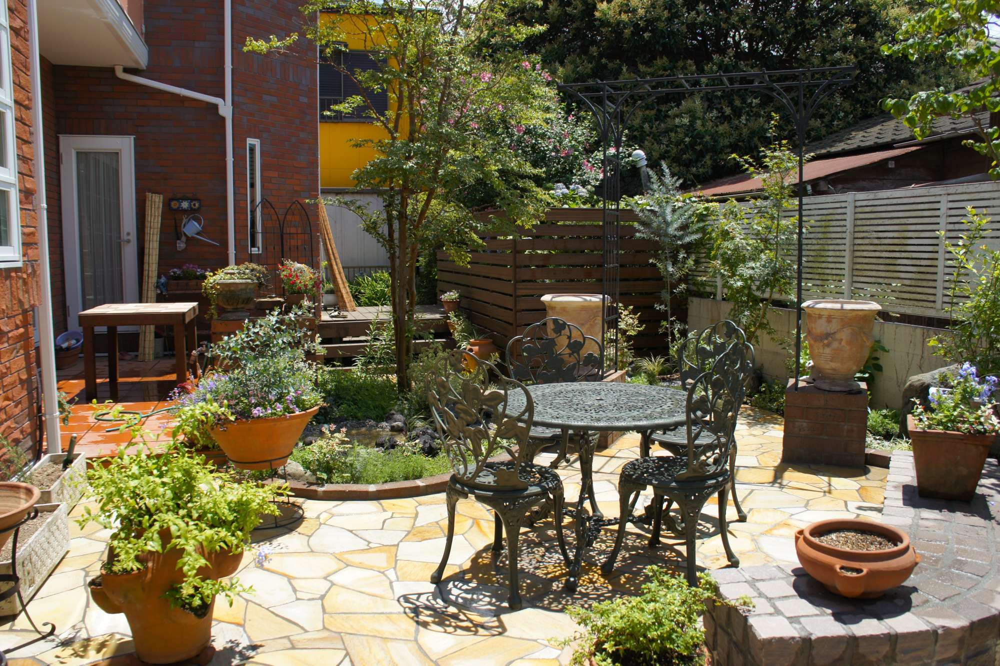 植栽は池の中やレンガの花壇、テラコッタ製鉢、植木等、配植を多く設けました。