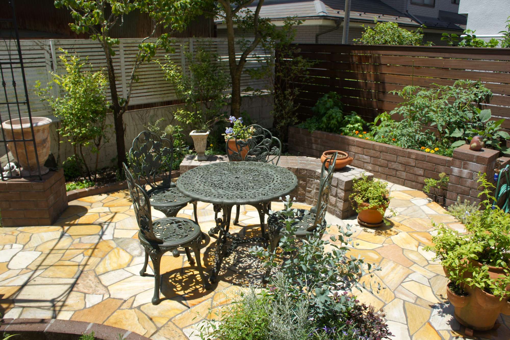 洋庭の中心に、レンガで池を造り、周囲に花壇やベンチも。