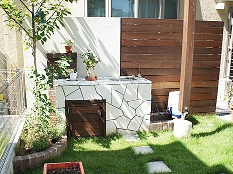 石張りの水栓にウッドの収納扉をつけて、お庭で使用するものを収納、とても便利です。