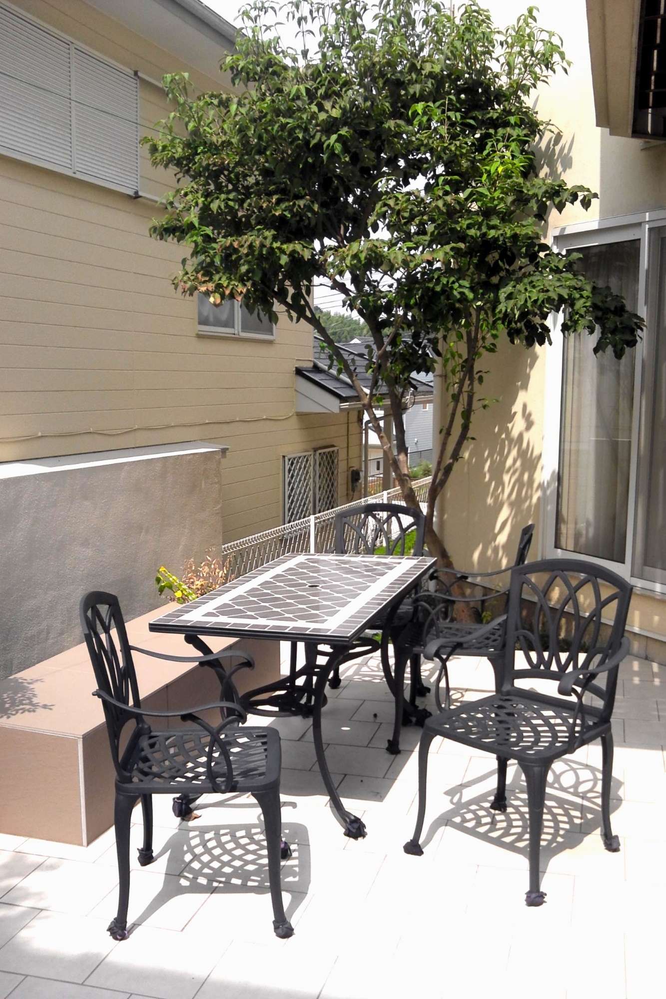 お庭は清潔感あるタイルテラスを施工し、くつろげる空間を設けました。